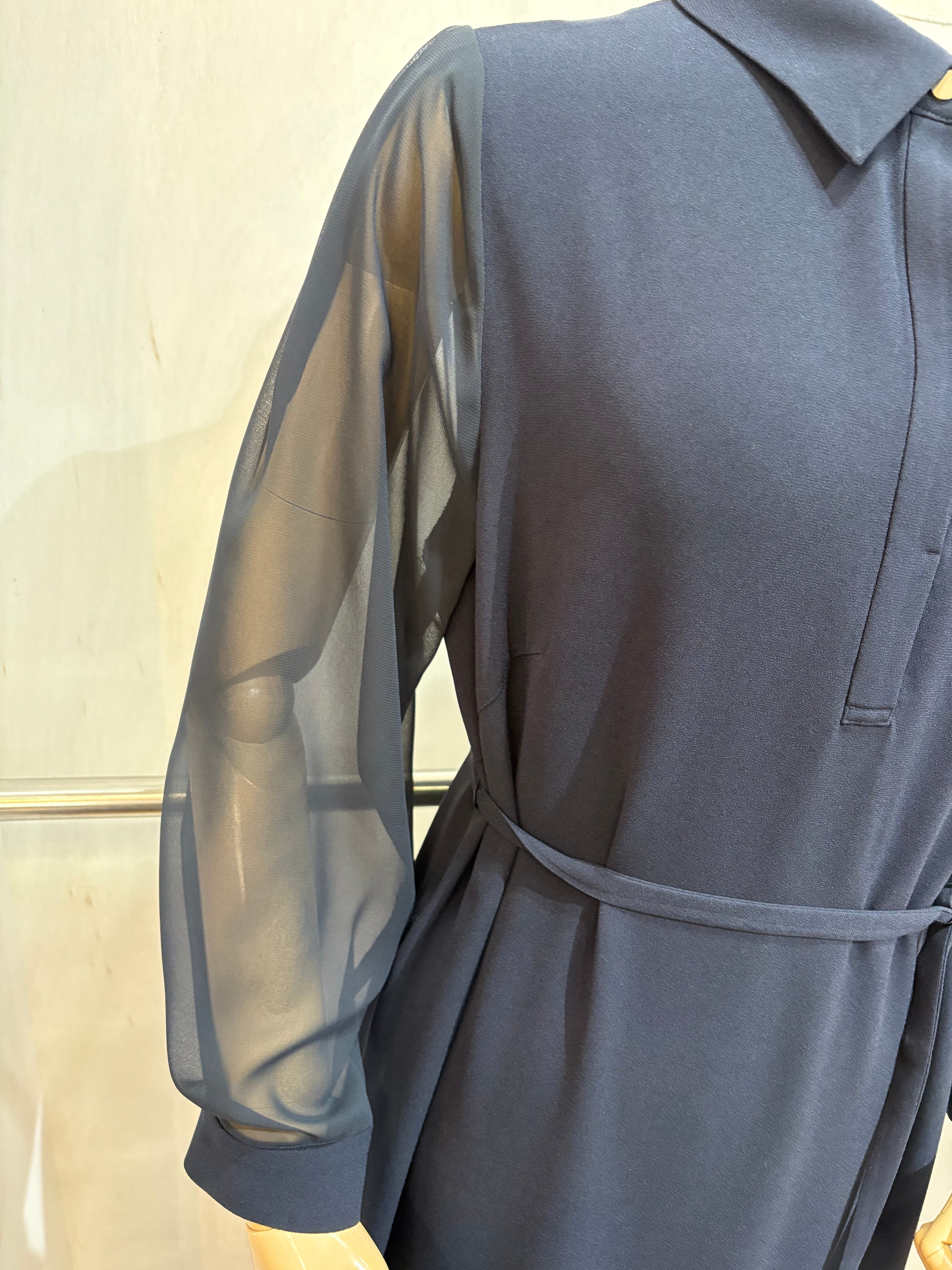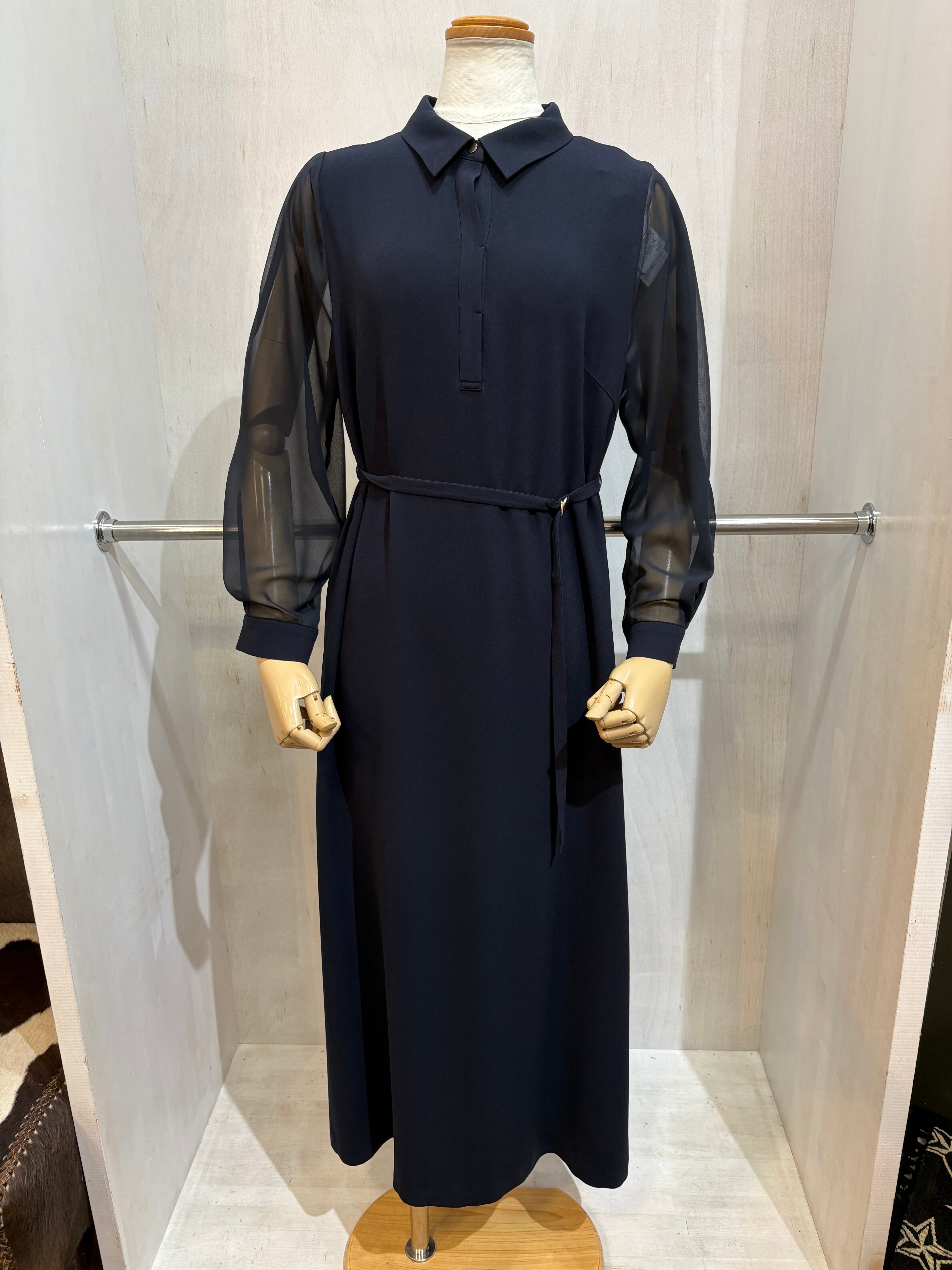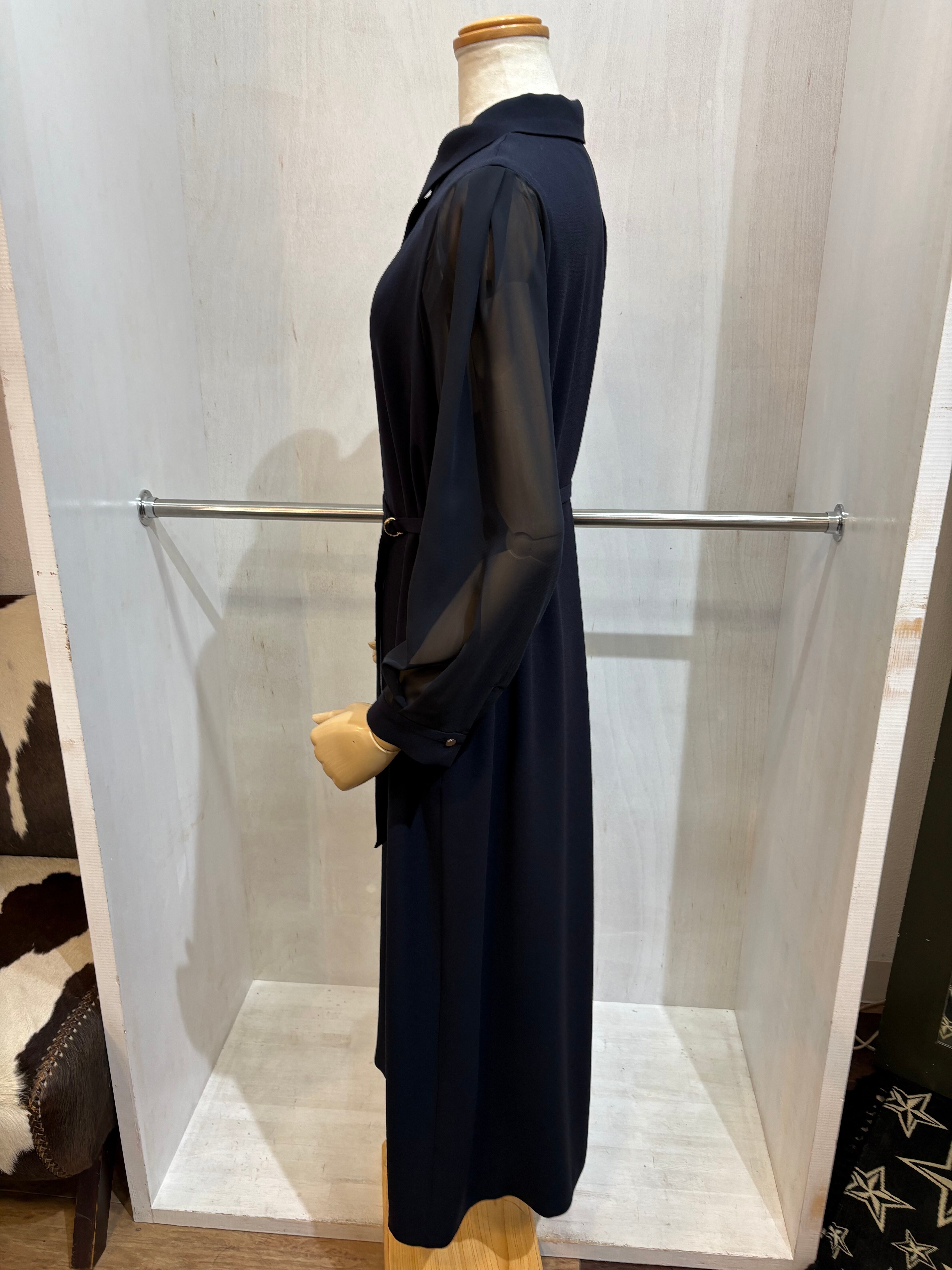 袖がシアー感のある素材を使用したワンピース。サイズはフリーサイズでベルト付きでウエストを絞ぼっても、ベルト無してでも着れます。