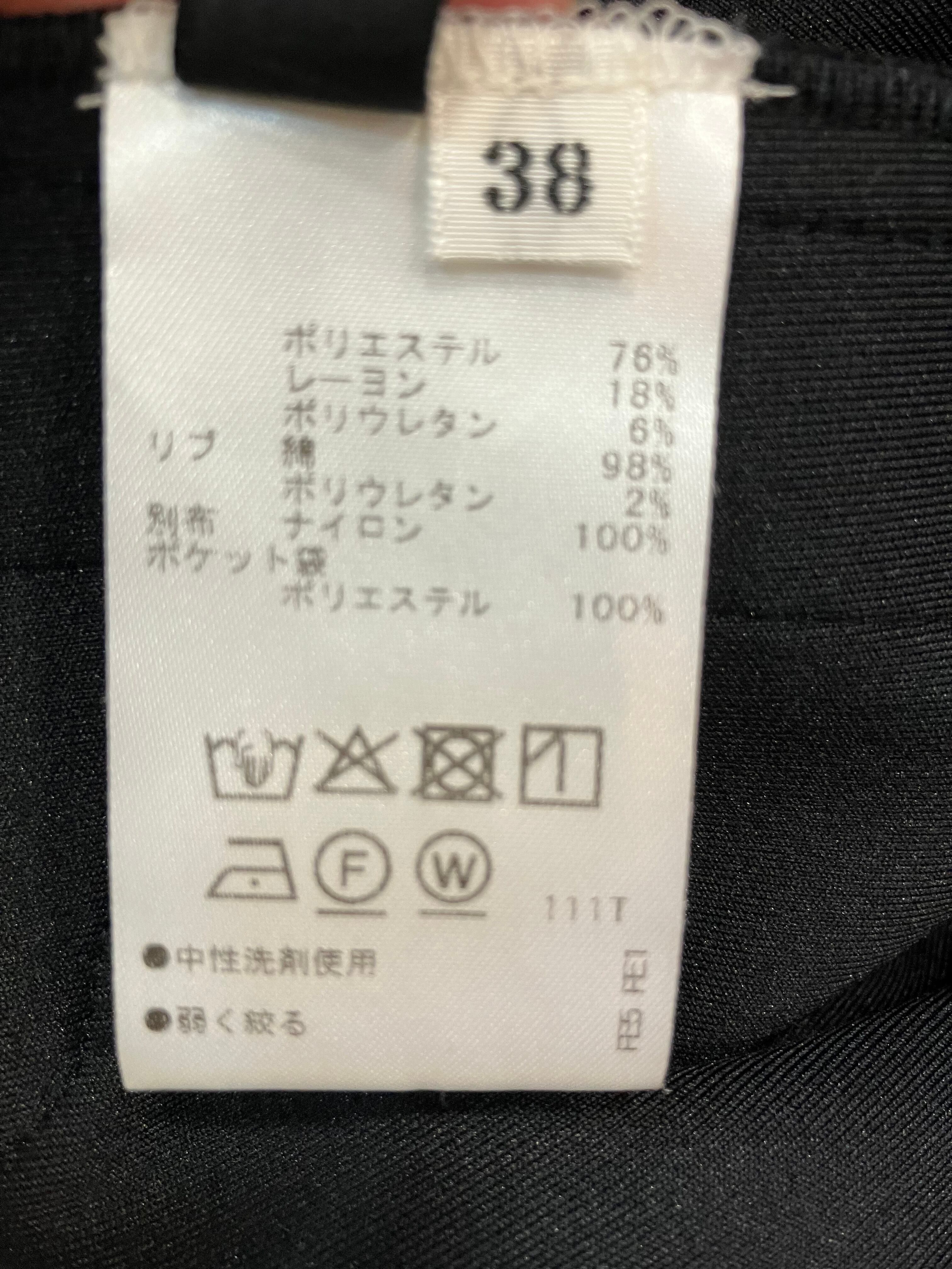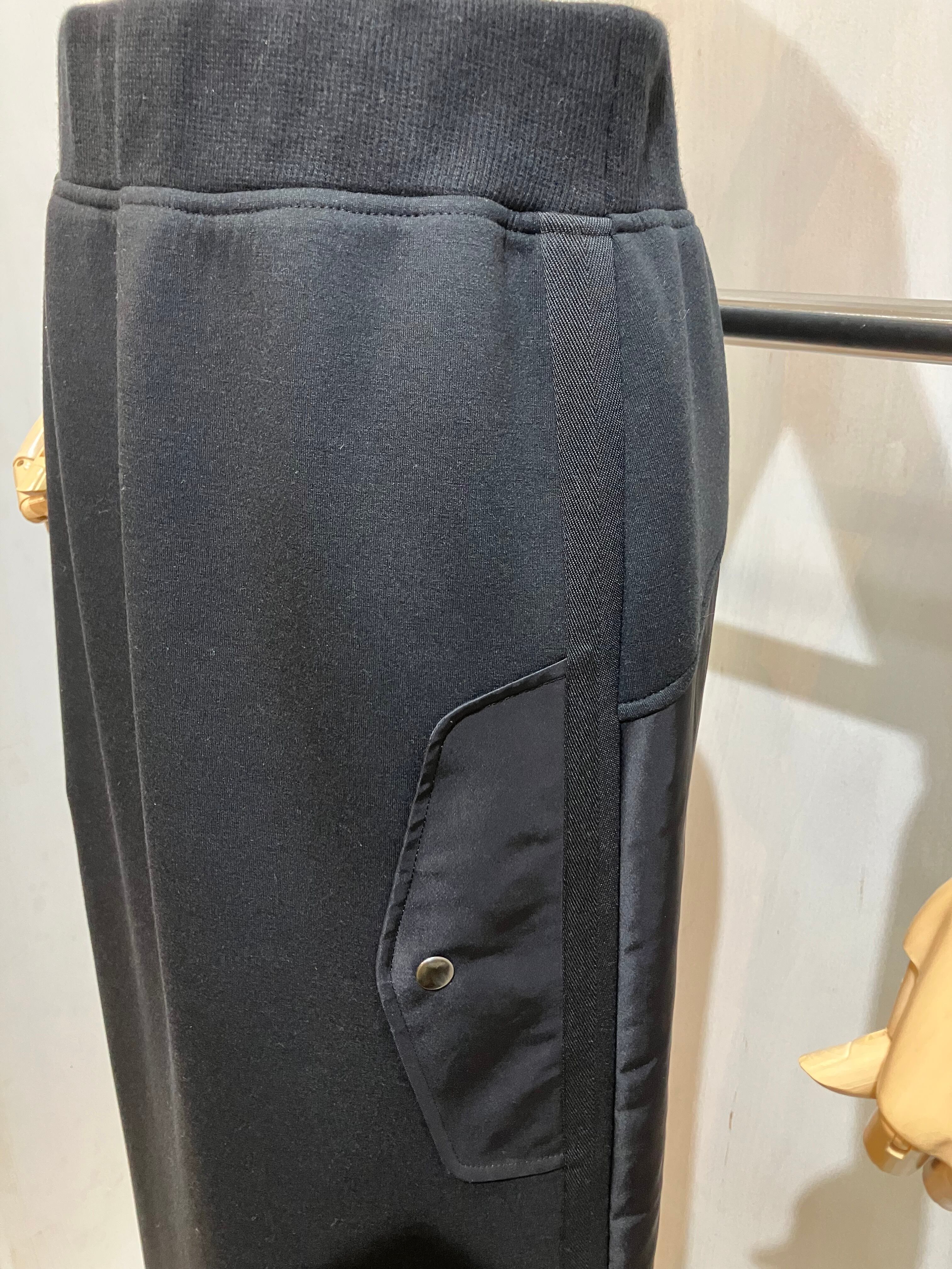 ウエストリブで、前面にダンボールニットを使用し、後綿はナイロンを使用し、生地違いのタイトスカート。左側には蓋付きポケット有り。