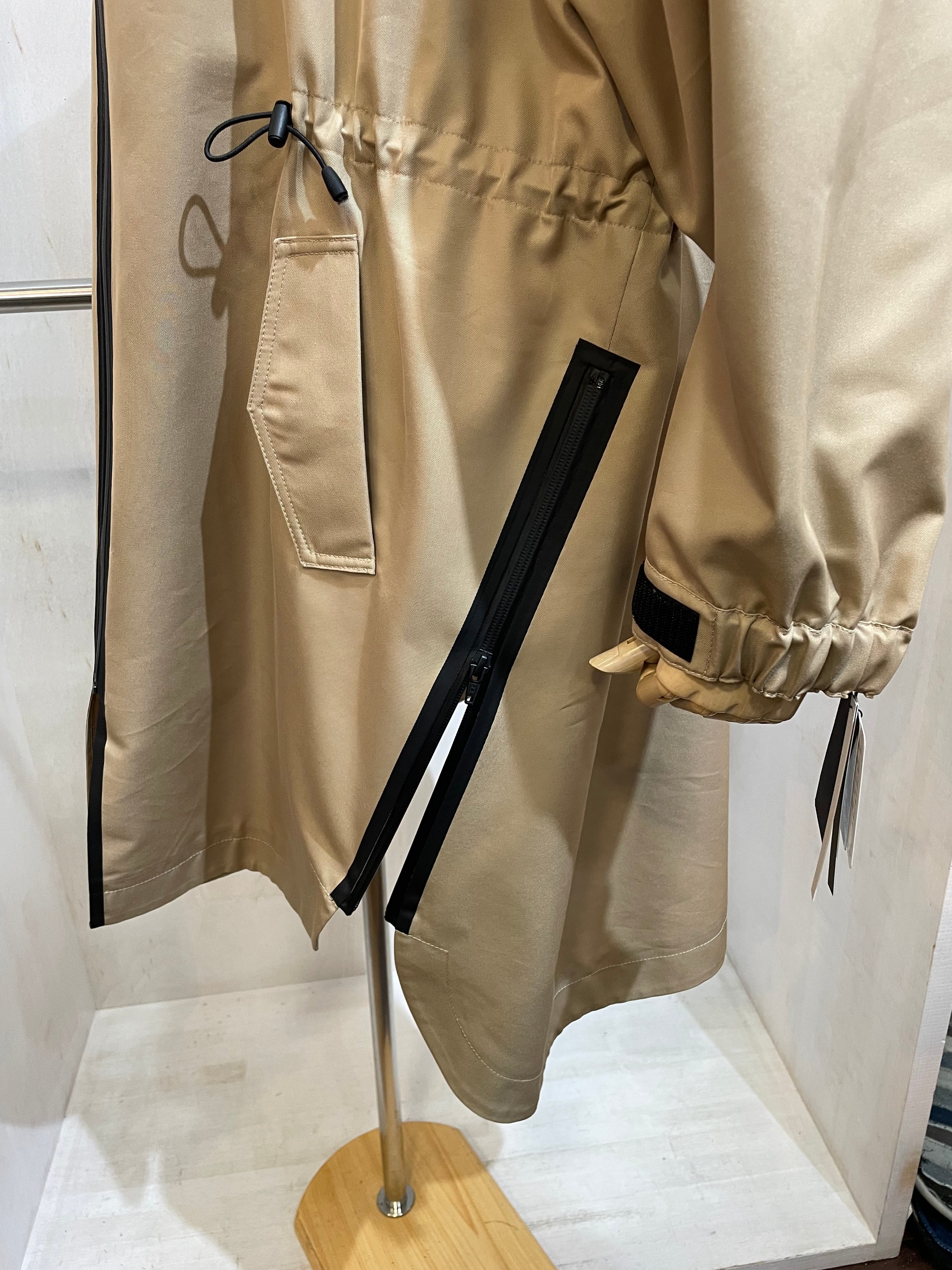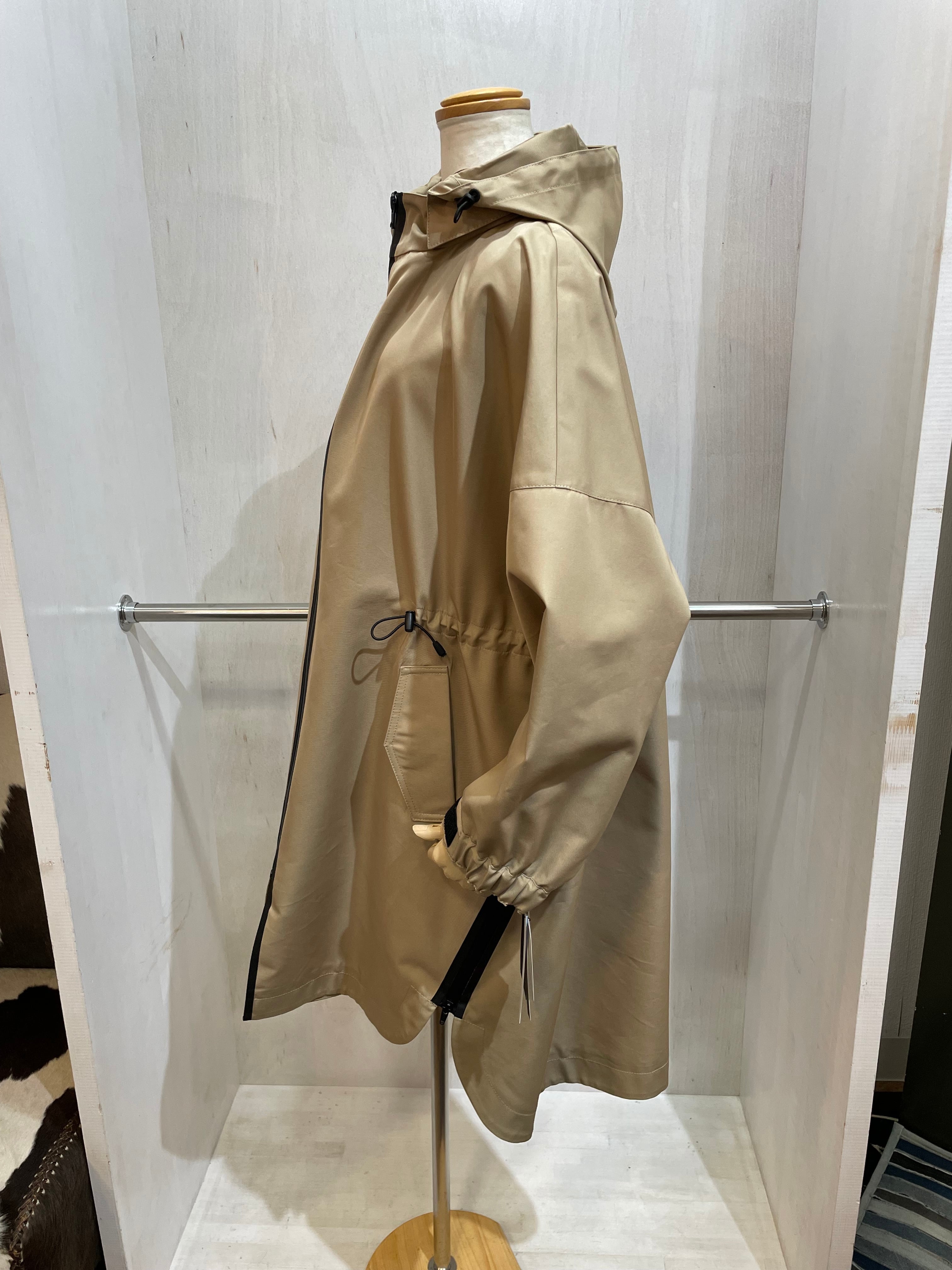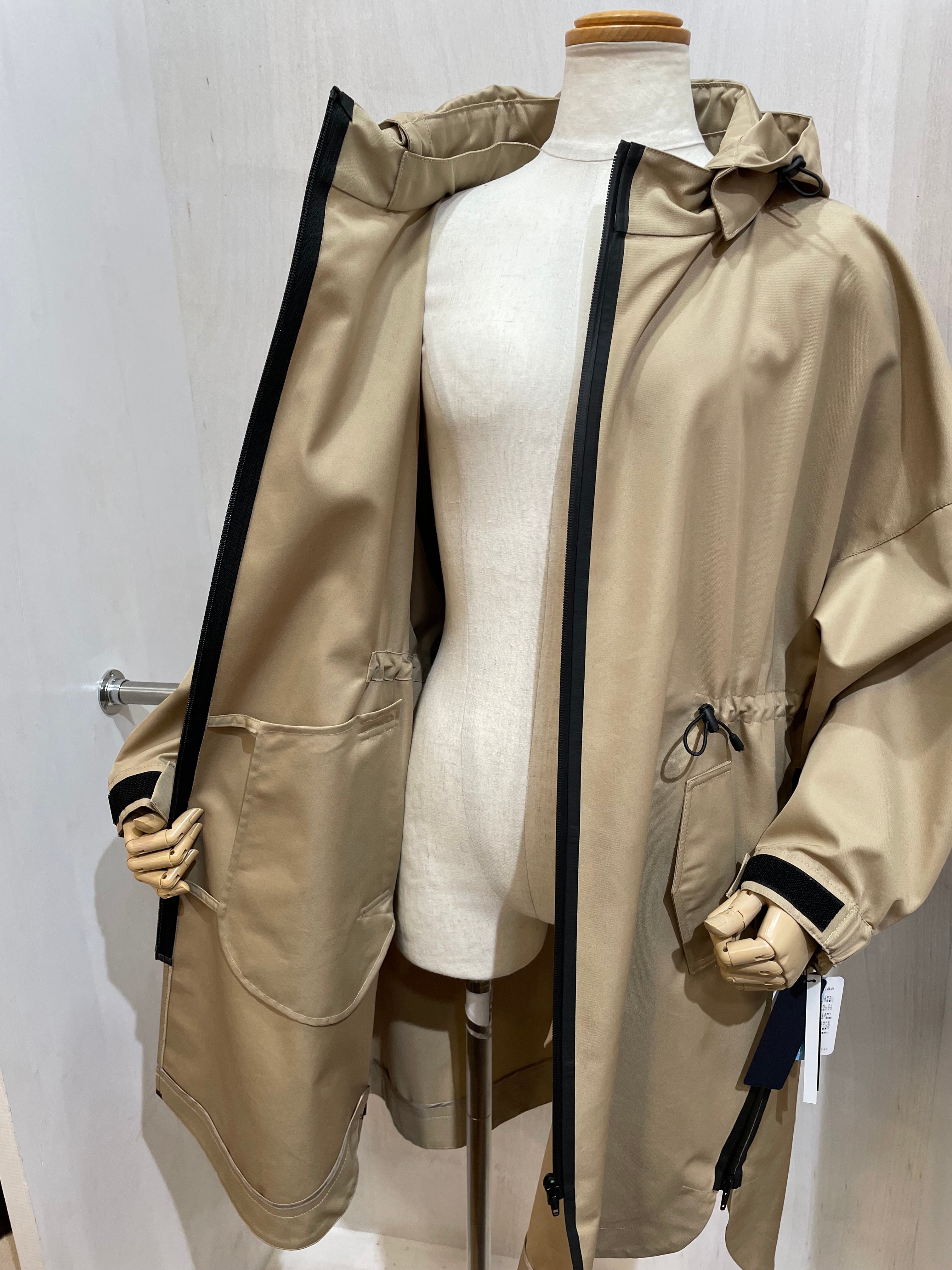 腰のラインにドローコード、サイドに斜めにジップスリット、パーカーの取り外しなどがえり、いろんなアレンジで着れる、万能コート。
