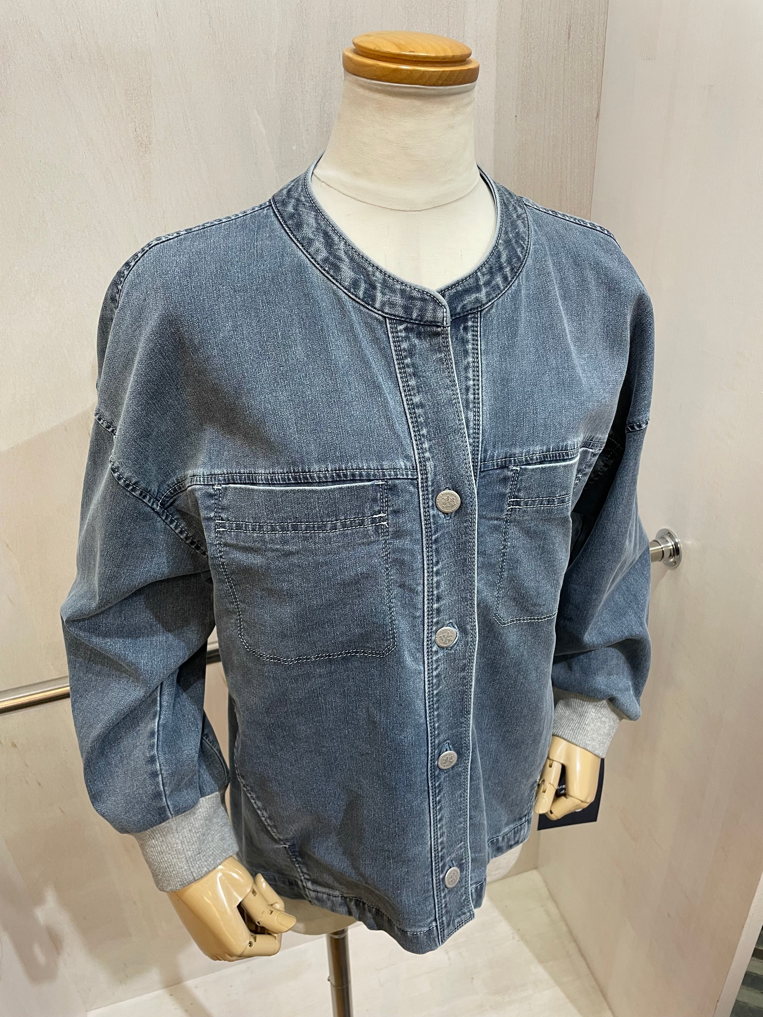 ノーカラー(襟なし)の袖リブジャケット。