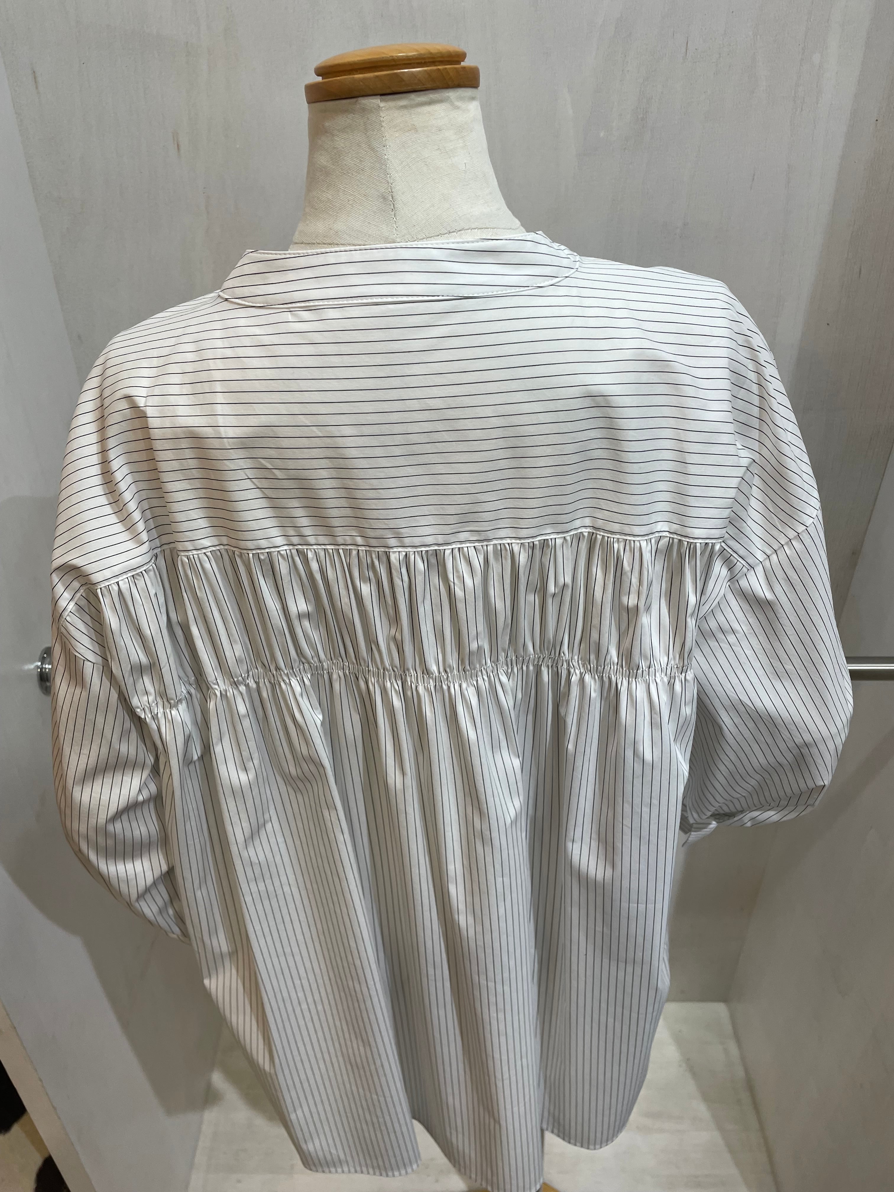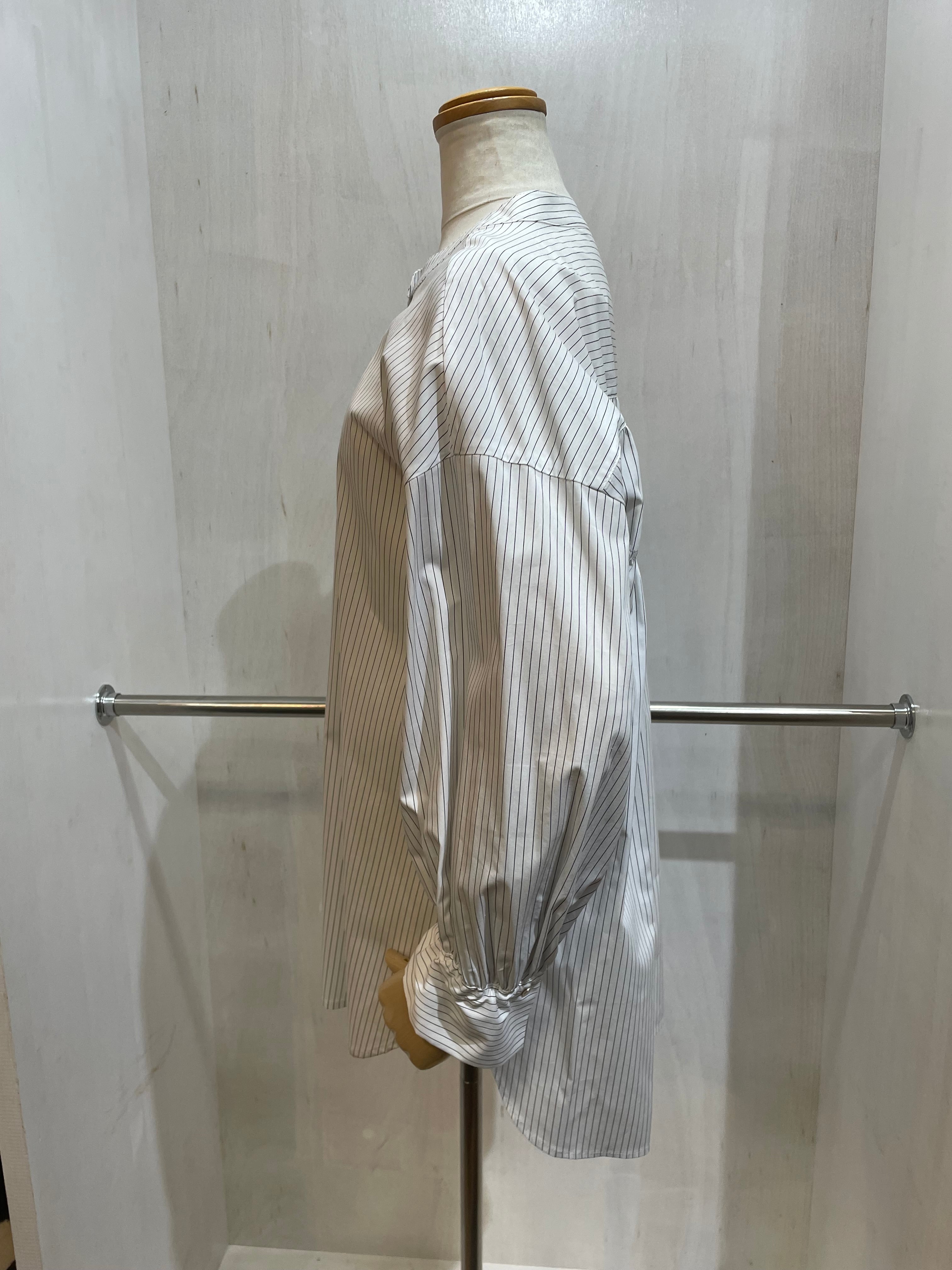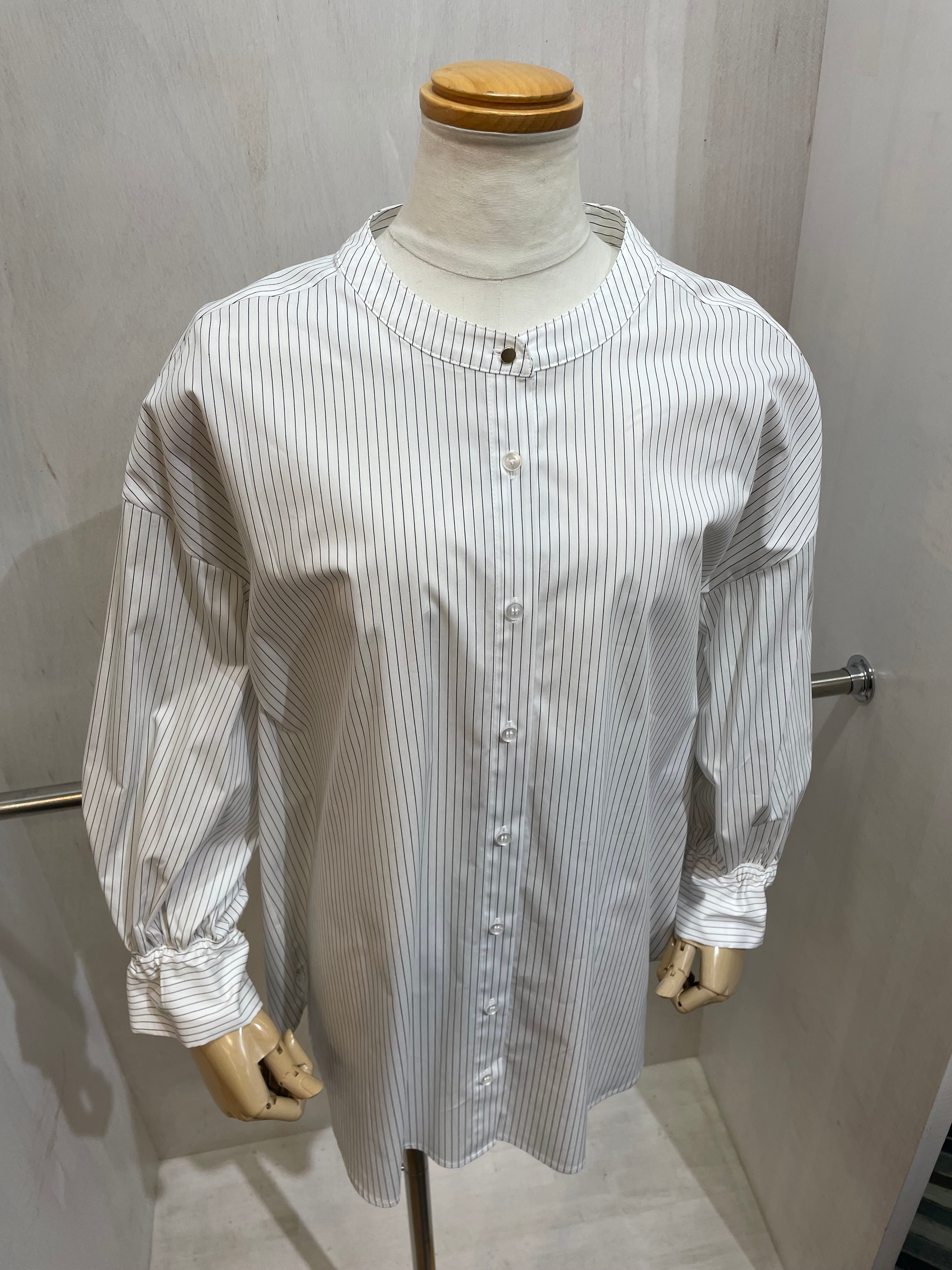 バンドカラー(襟なし)の丈が長めなストライプシャツ。袖口と背面はシャーリングが可愛いく、個性がありながらシャツのキッチリ感を残して着こなせる一枚。