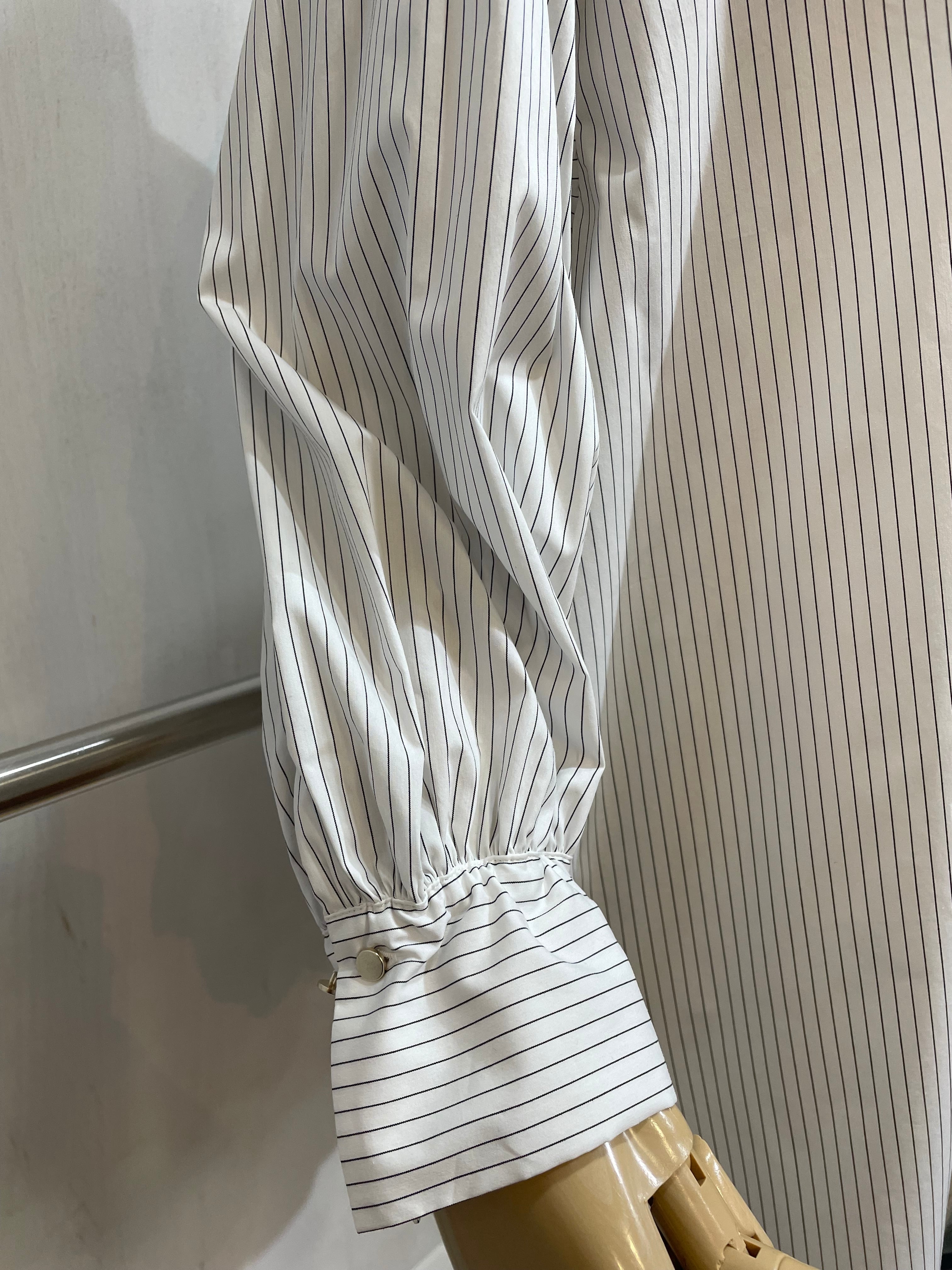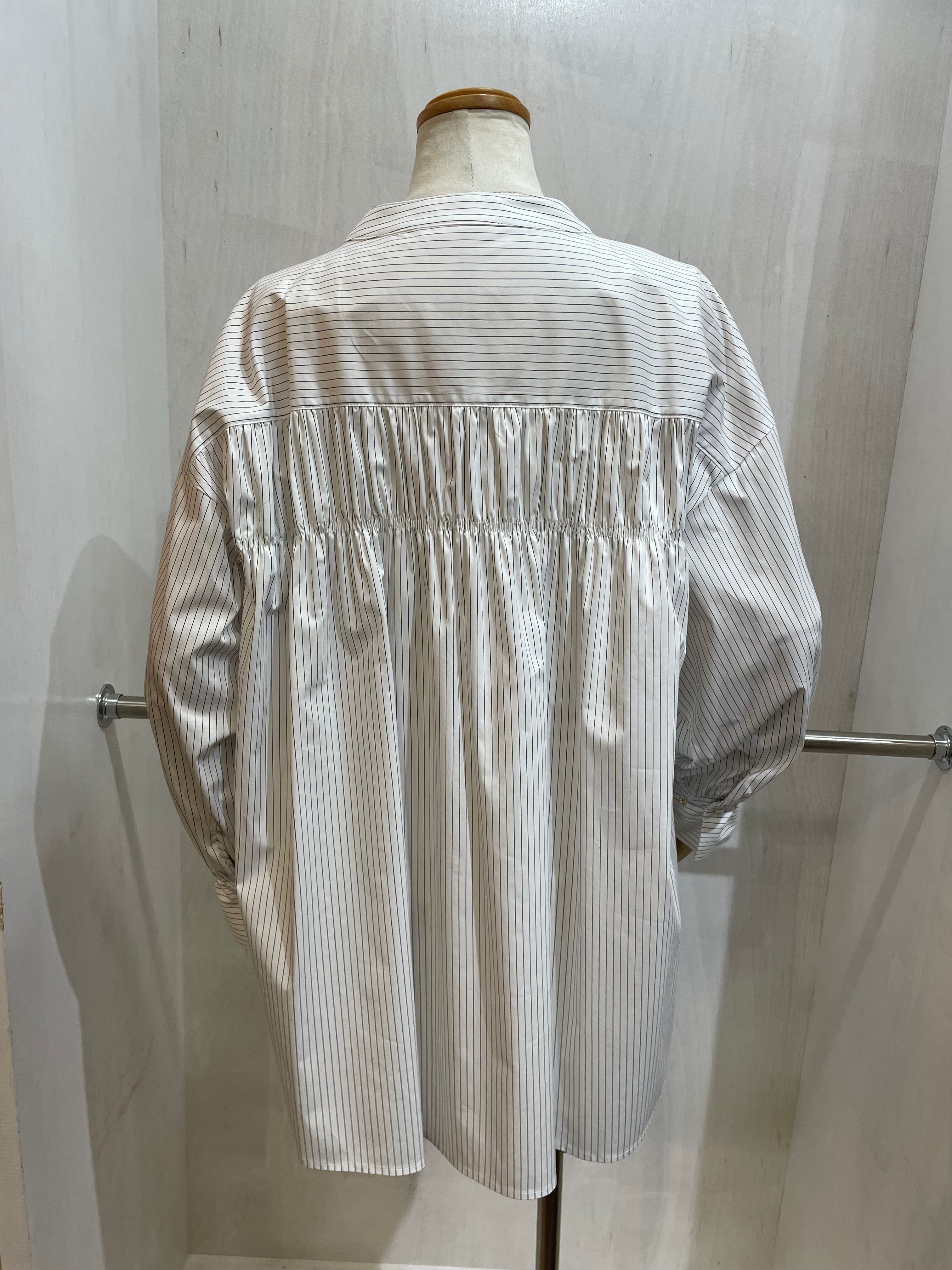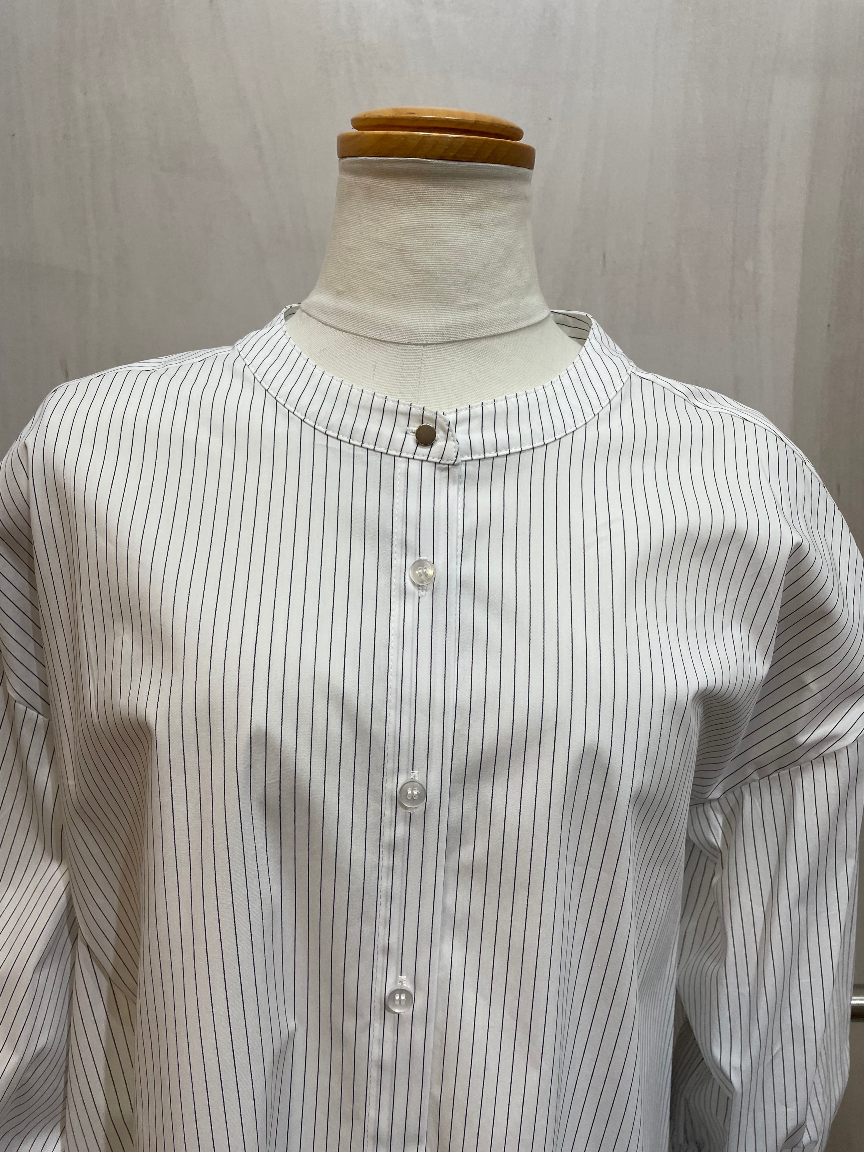 バンドカラー(襟なし)の丈が長めなストライプシャツ。袖口と背面はシャーリングが可愛いく、個性がありながらシャツのキッチリ感を残して着こなせる一枚。