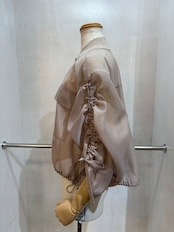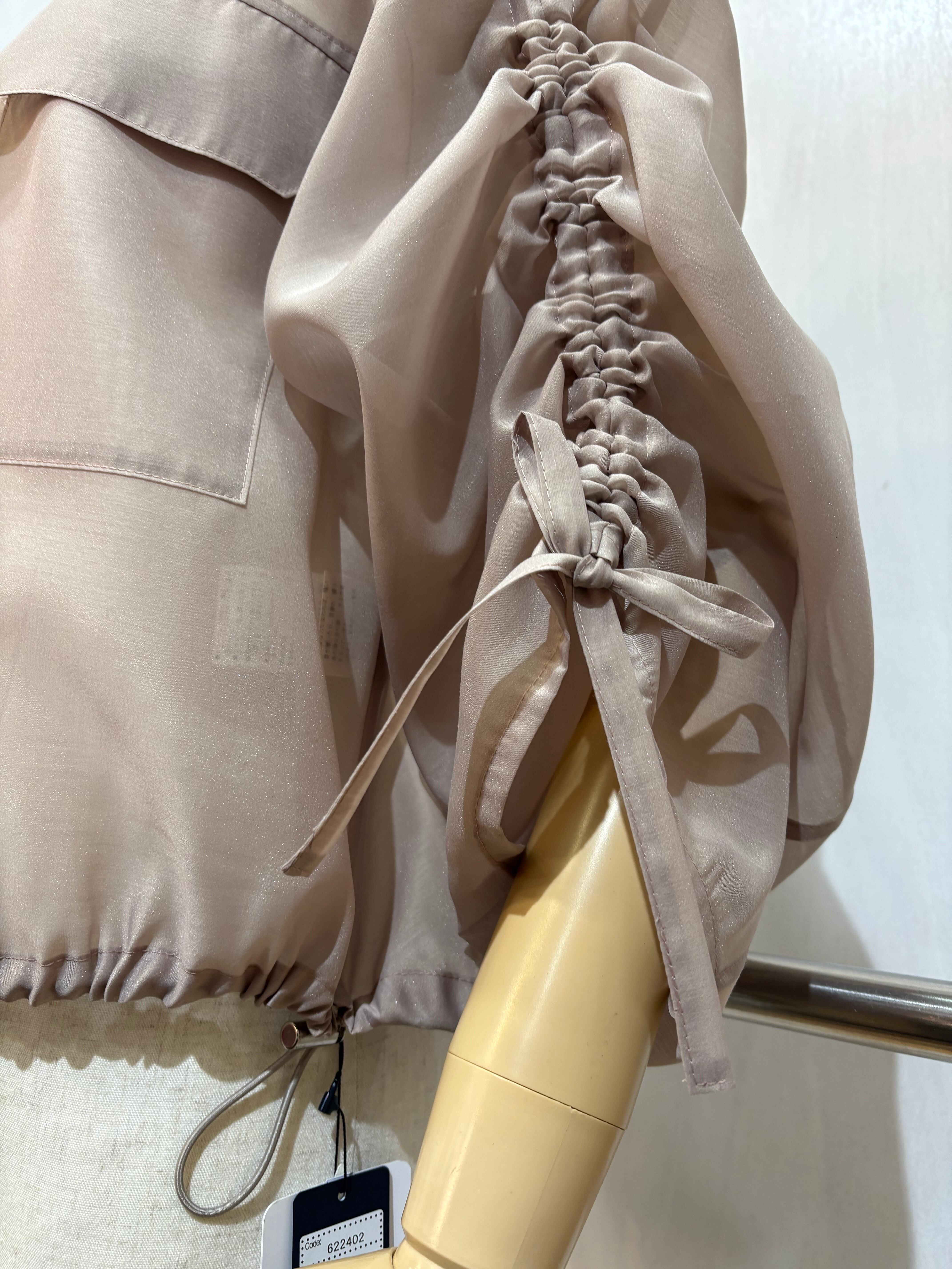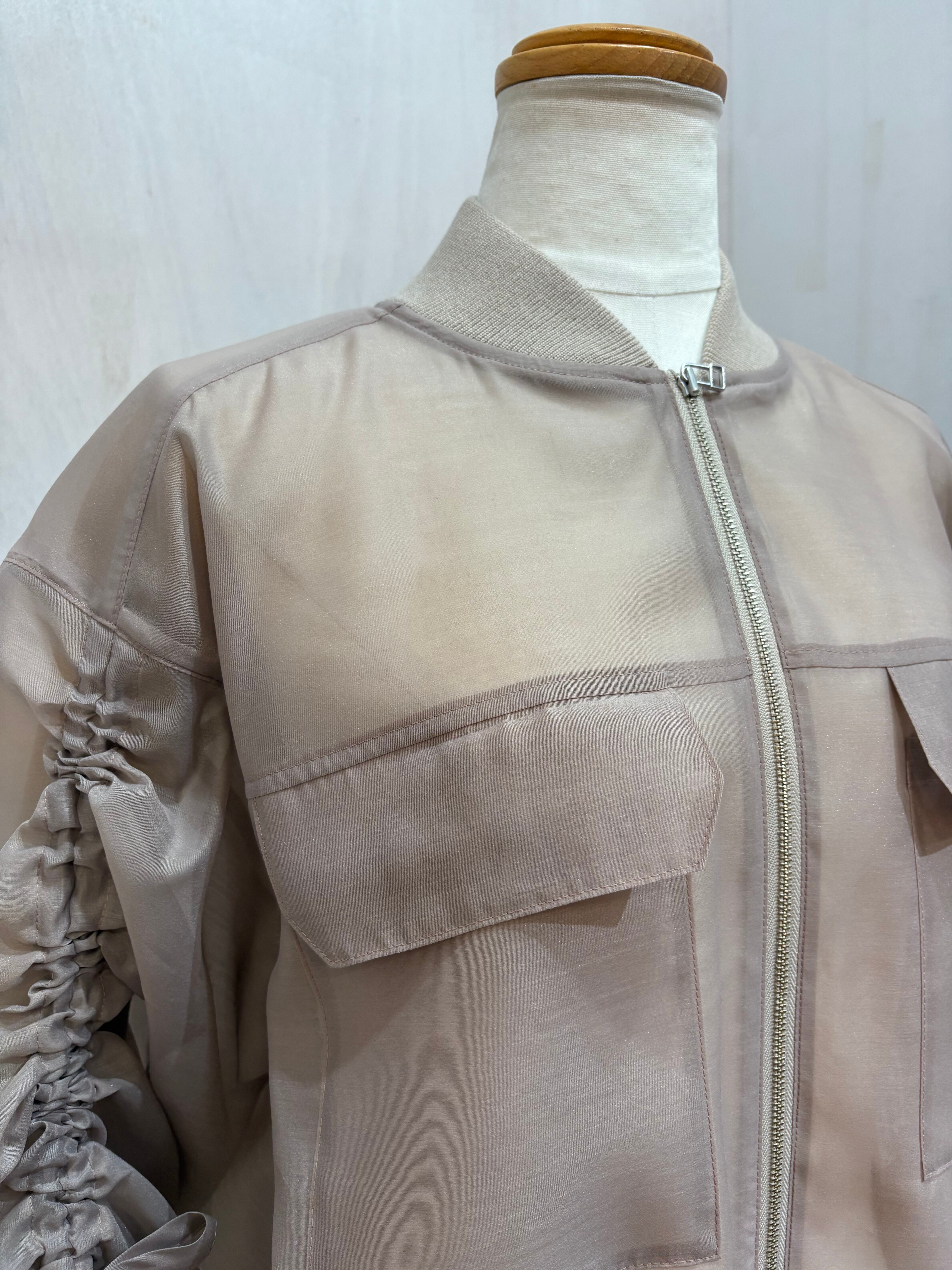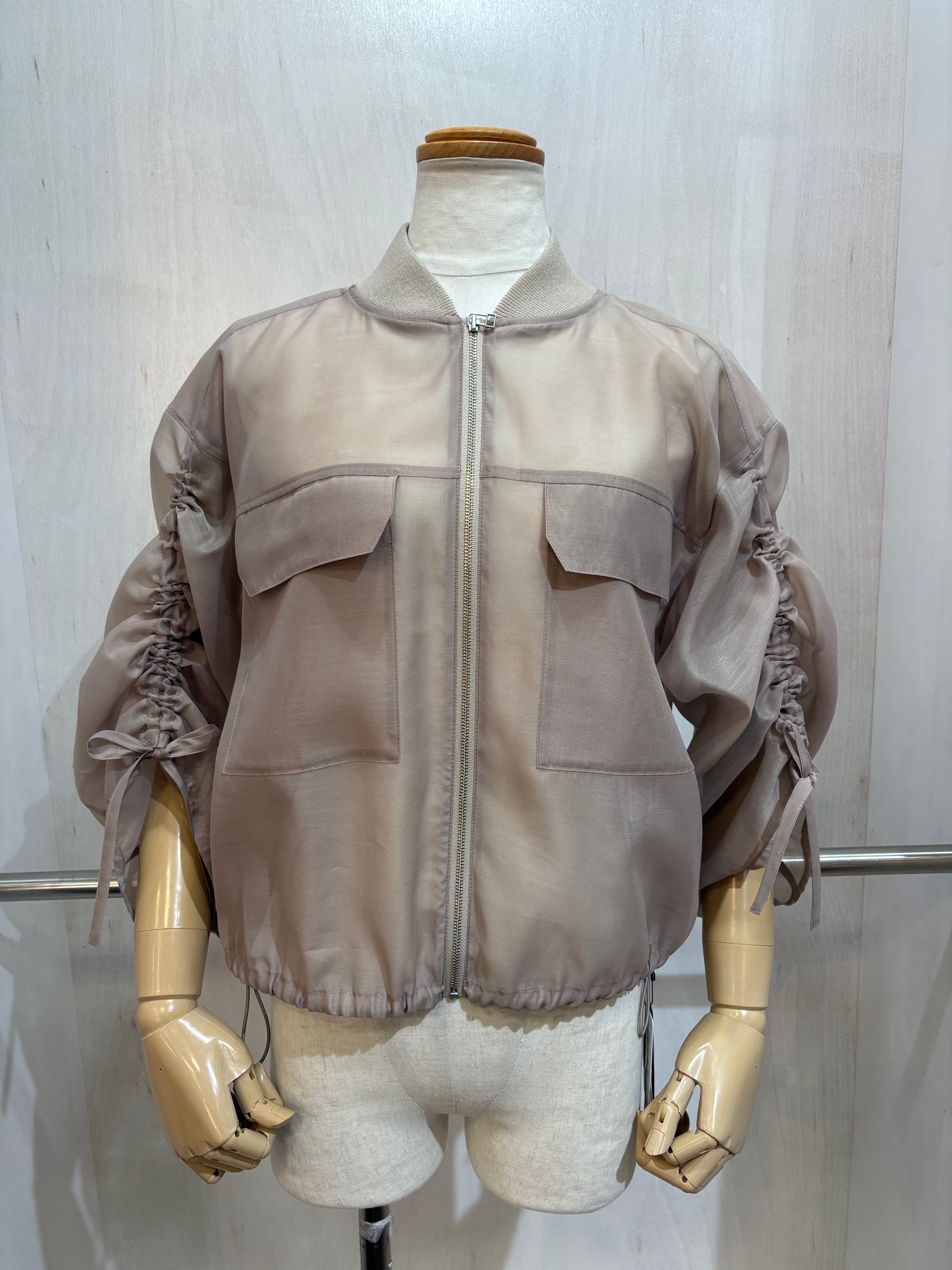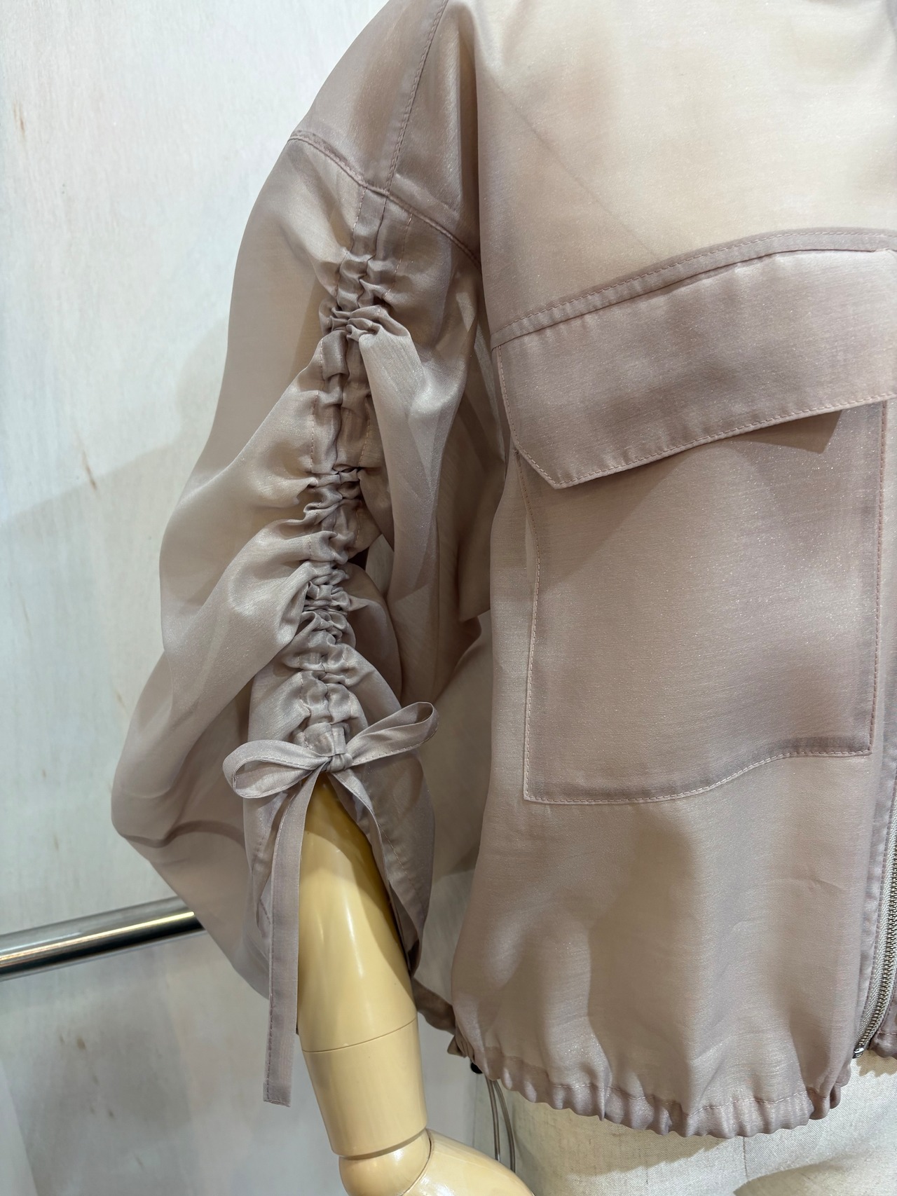 シアー素材のショート丈ブルゾン。袖はリボンでシャーリングされ、裾はドローコードで絞れます。