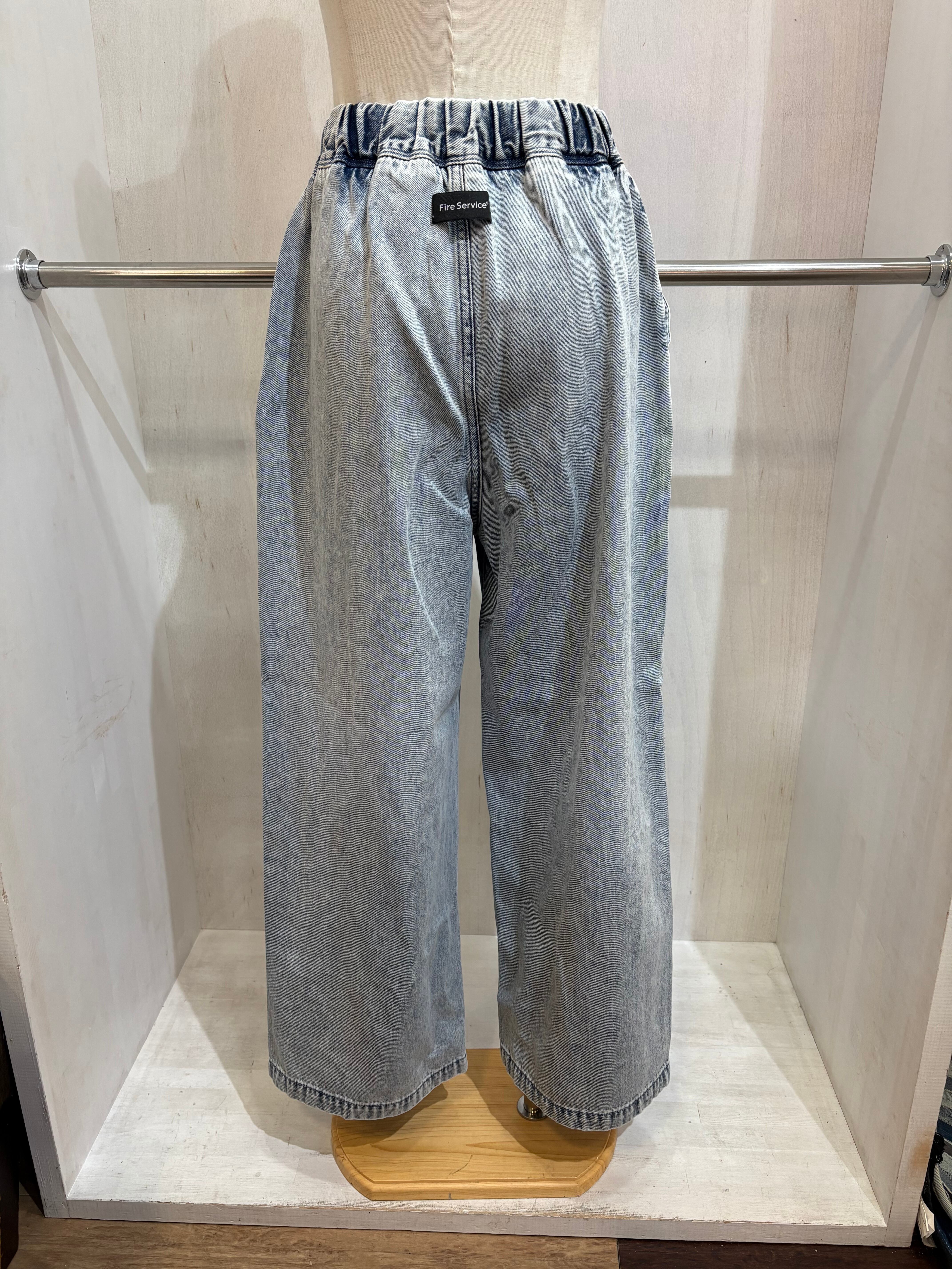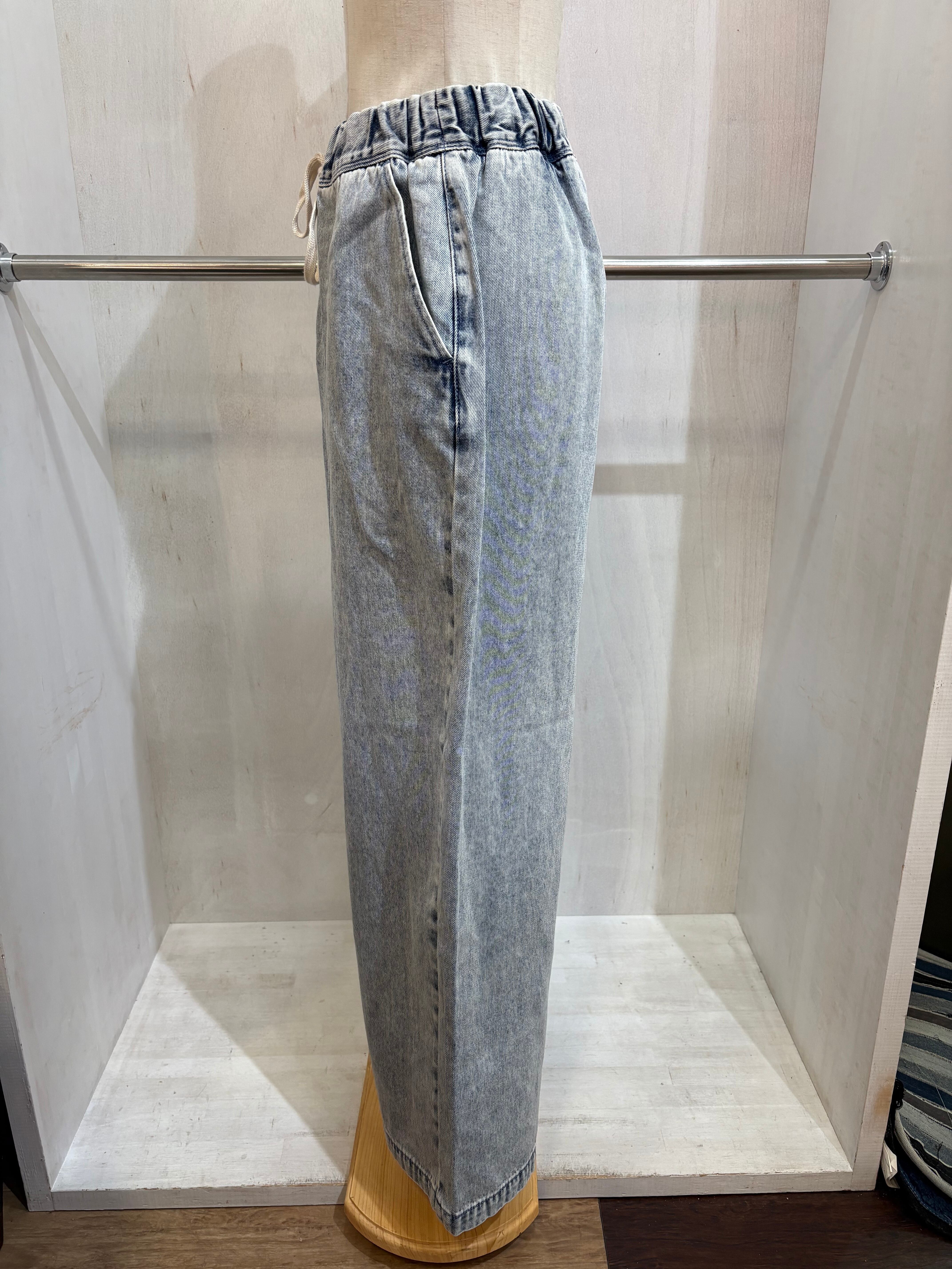 太めでワイドな、ウエスト総ゴムのイージーデニムパンツ。綿100%のデニムを使用しているのでハードに穿いても安心です。