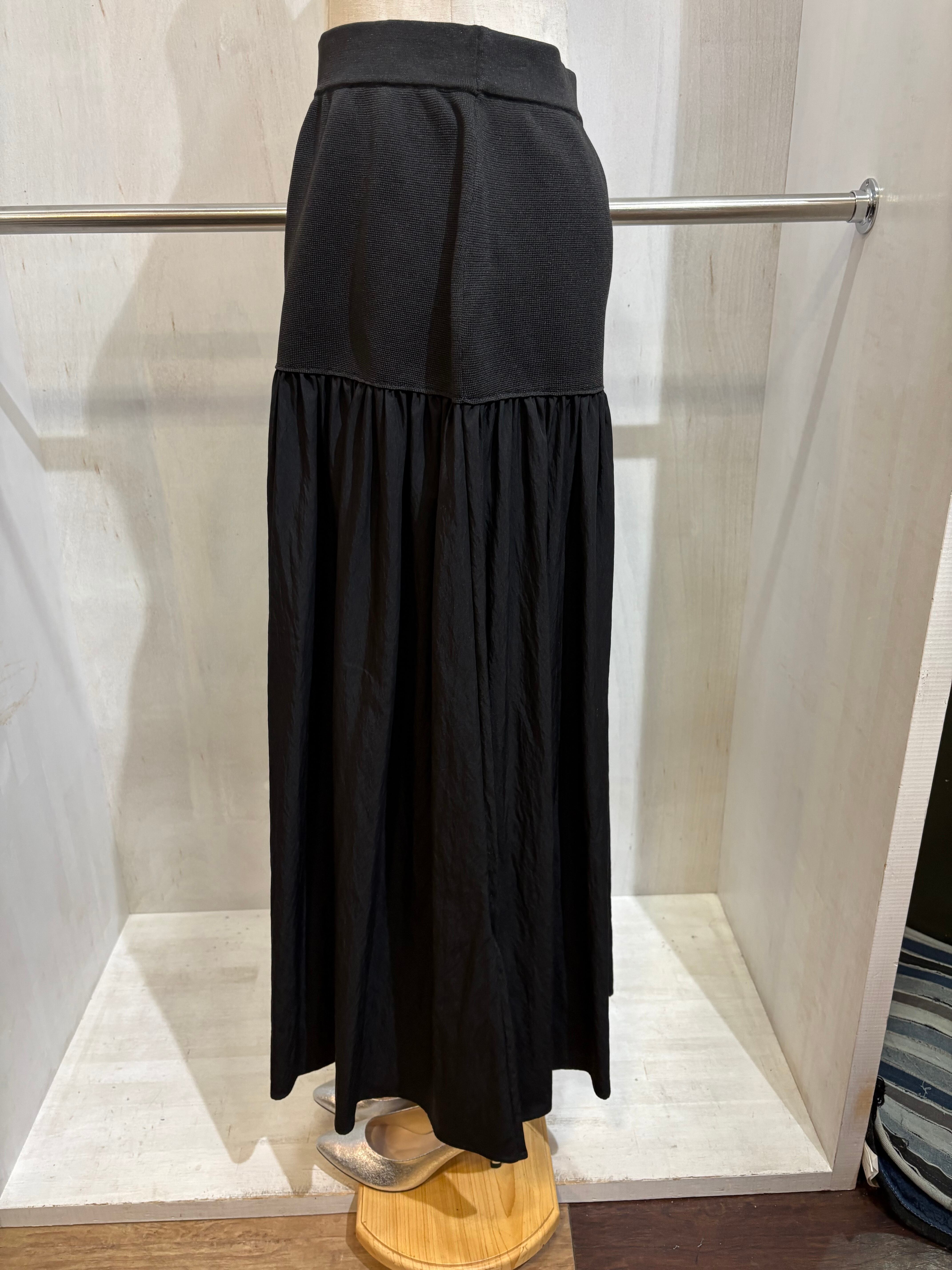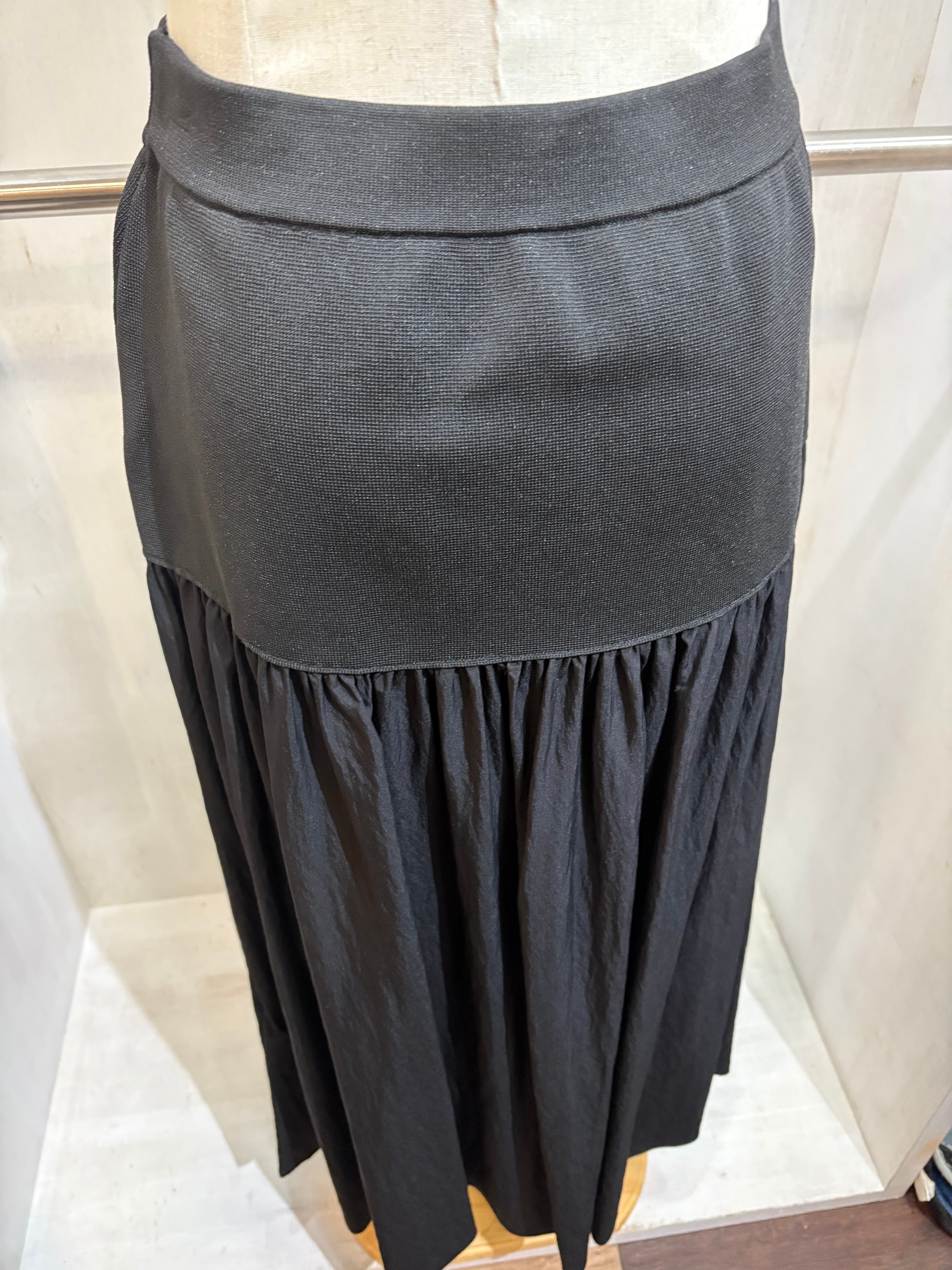 ウエスト総ゴムで、腰回りは伸縮性のある生地を使用し、股関節からはフレアスカートの様なデザインをしたスカート。