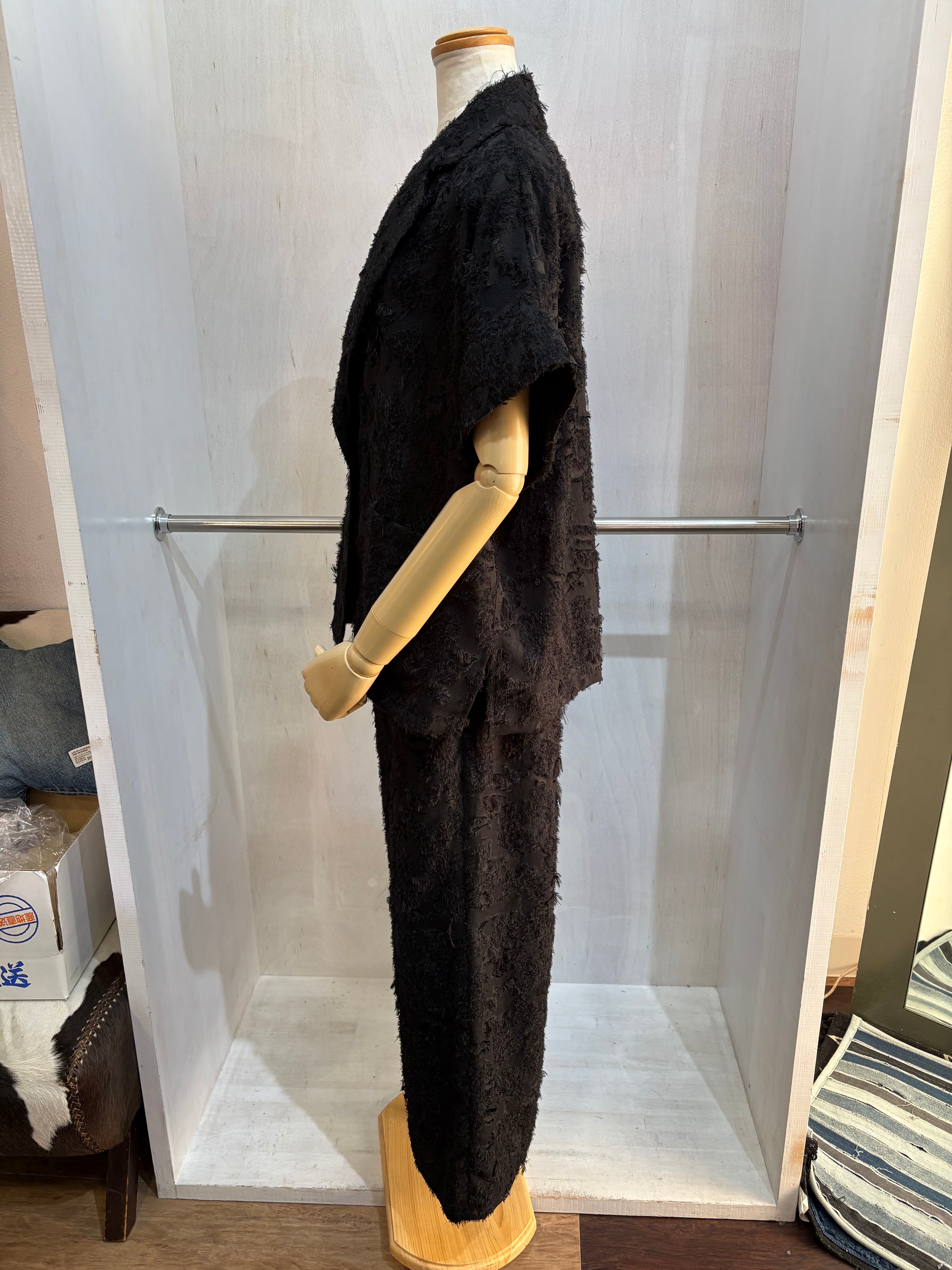 ジャガード生地の半袖ジャケット&ワイドパンツのセットアップ。