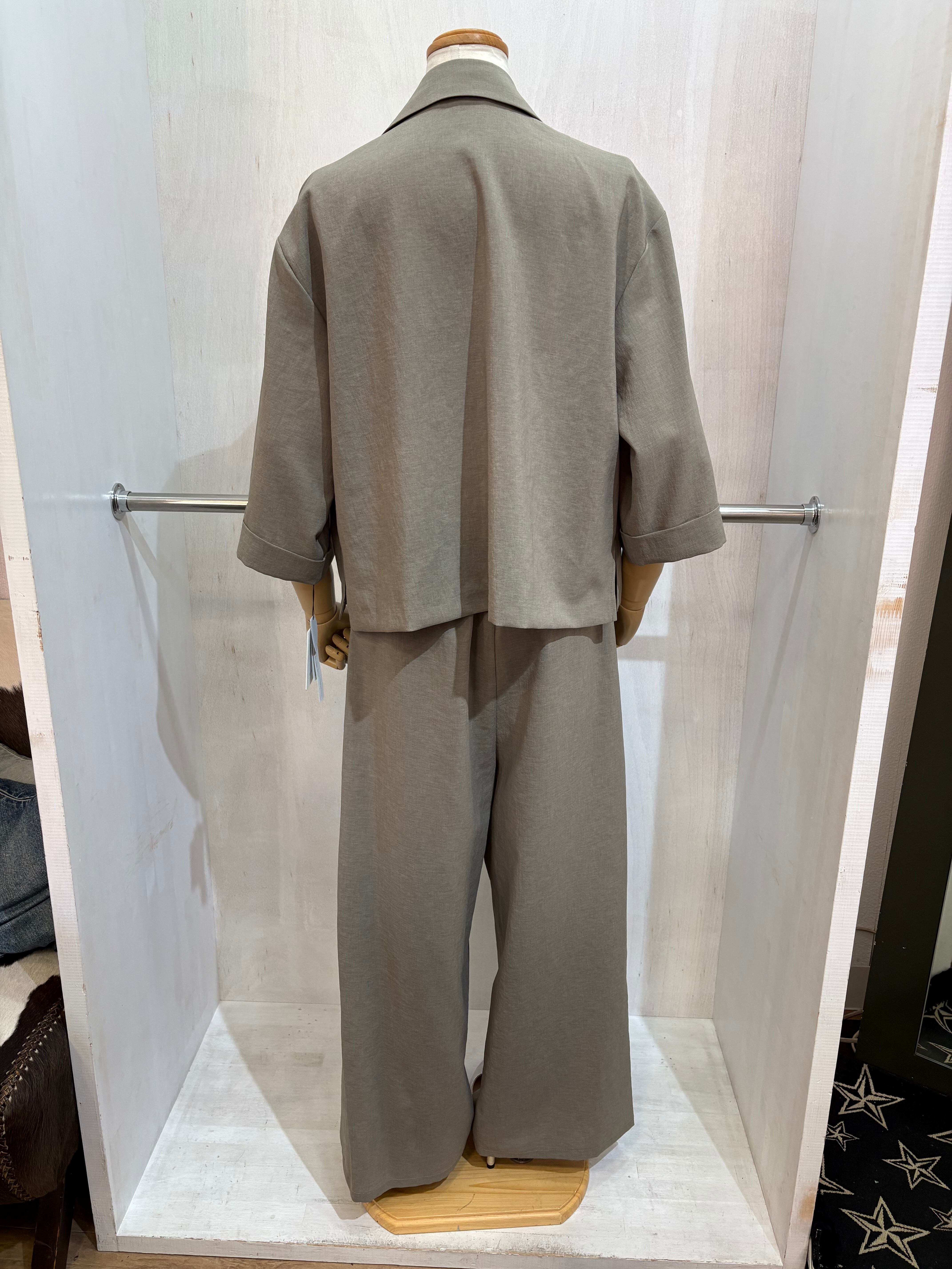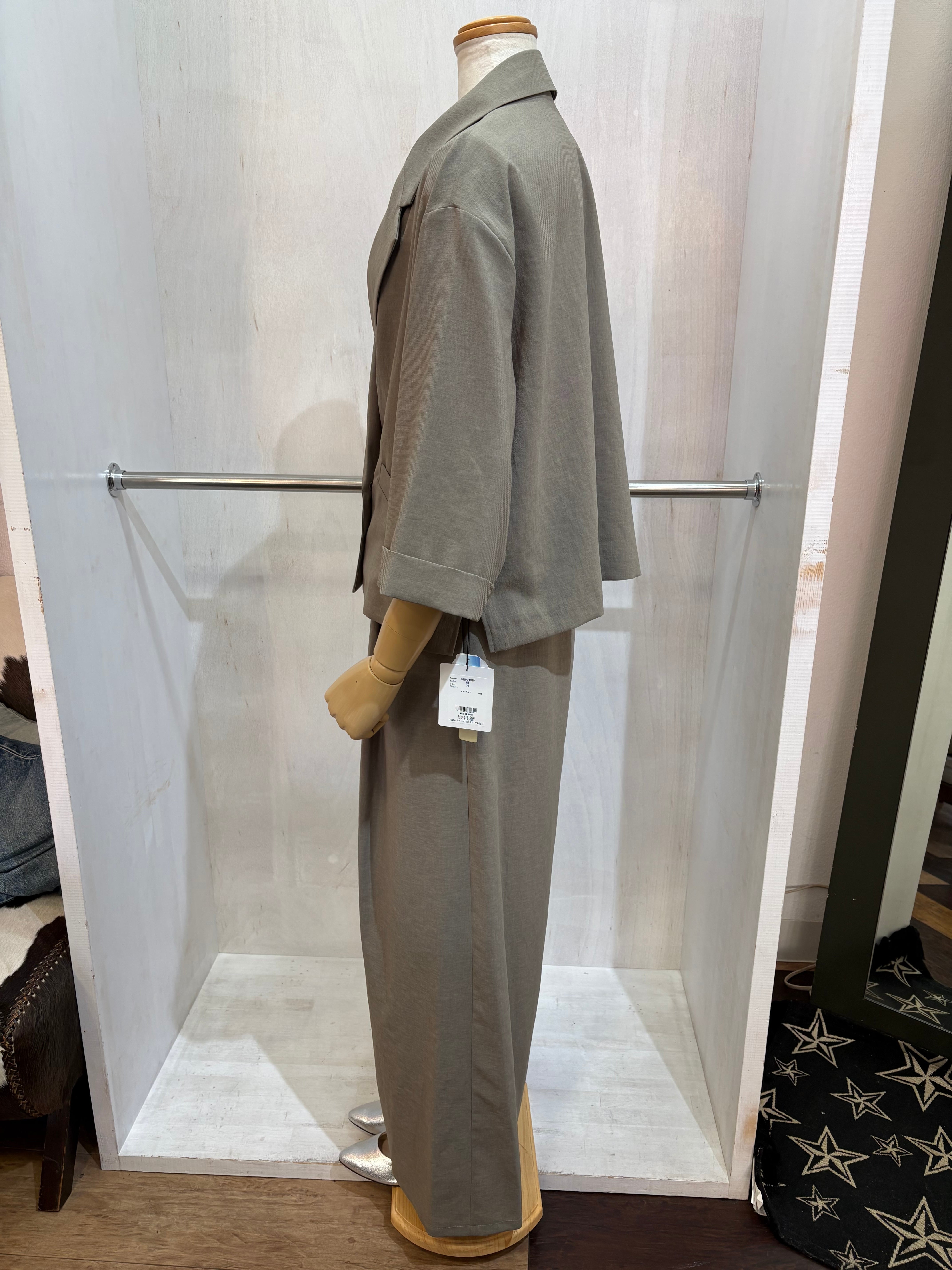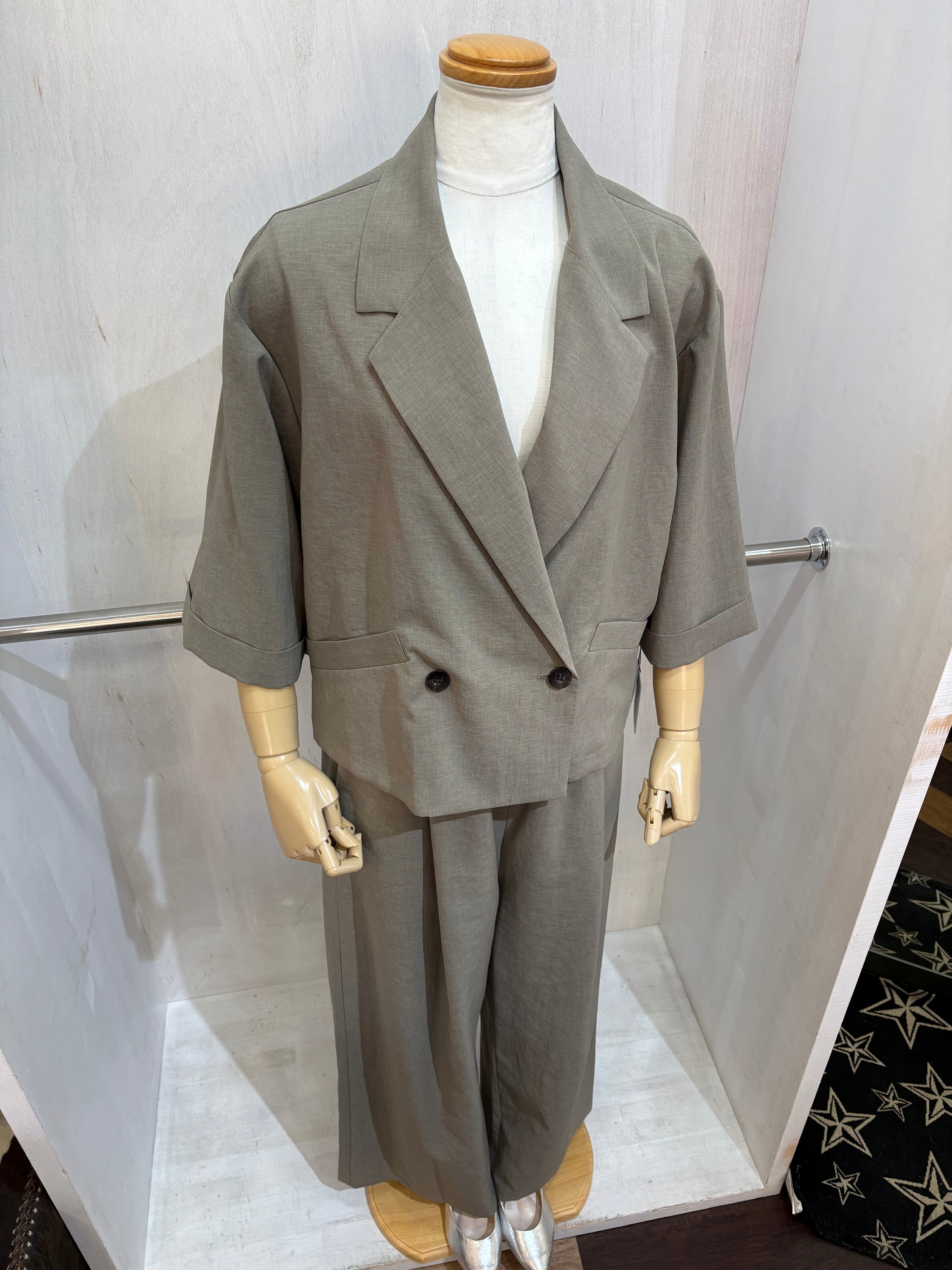 ショートダブルジャケットで袖は7分袖と快適で動きやすいデザイン。パンツは,イージーワイドタックパンツで、夏はTシャツとのコーディネートで重宝しそうです。