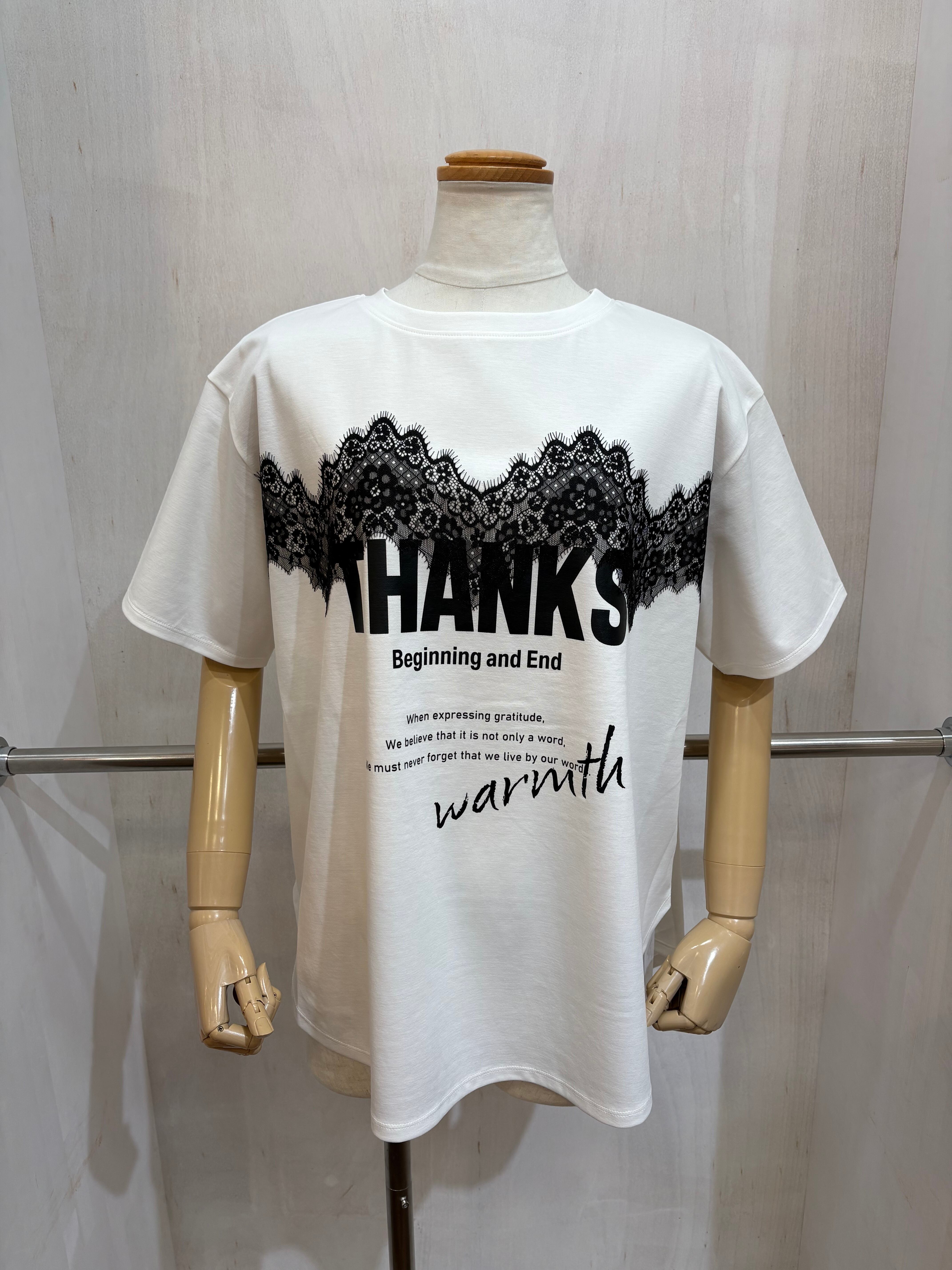 プリントとロゴの上にレースを貼ったデザインのややワイドめなTシャツ。