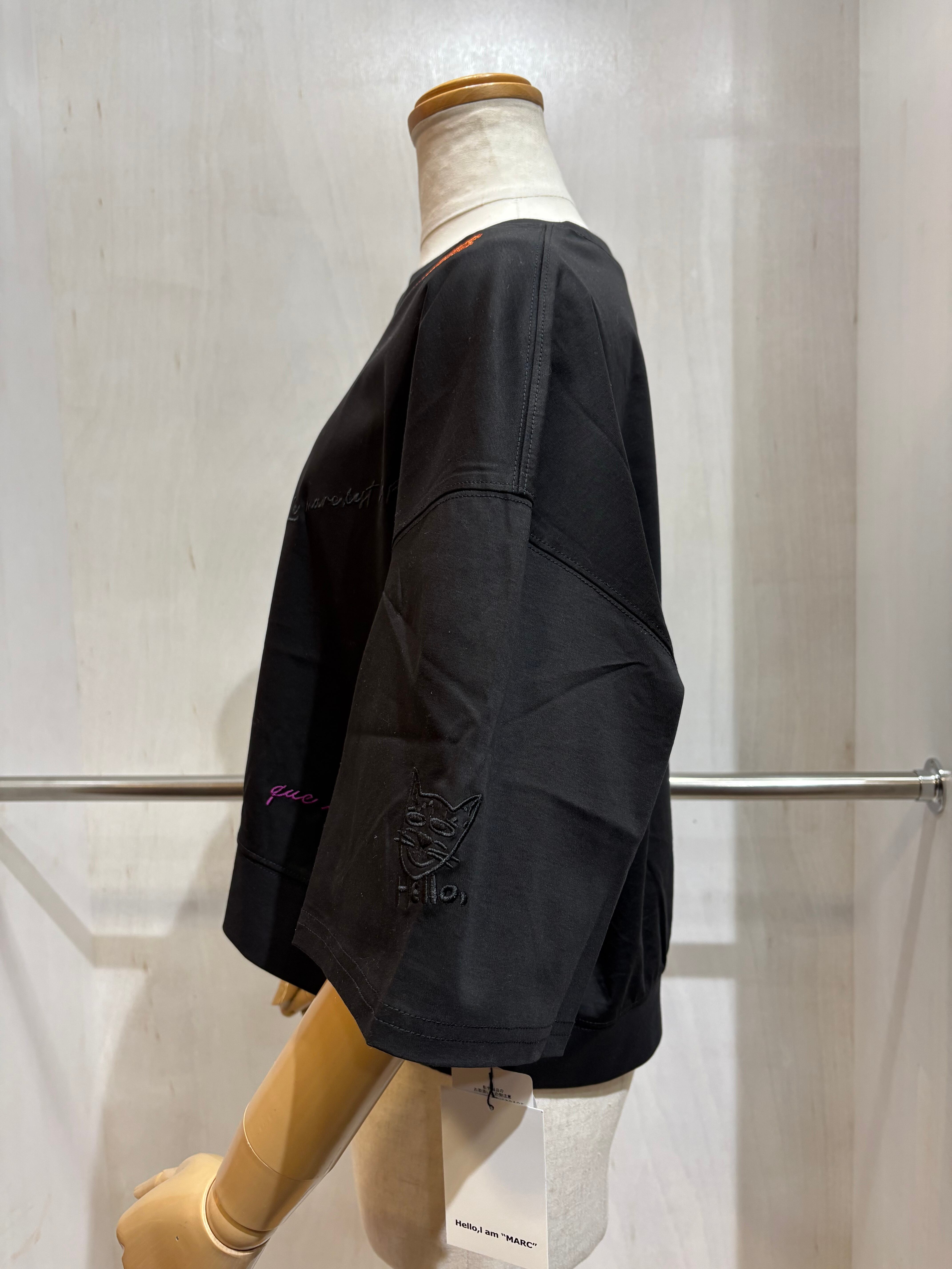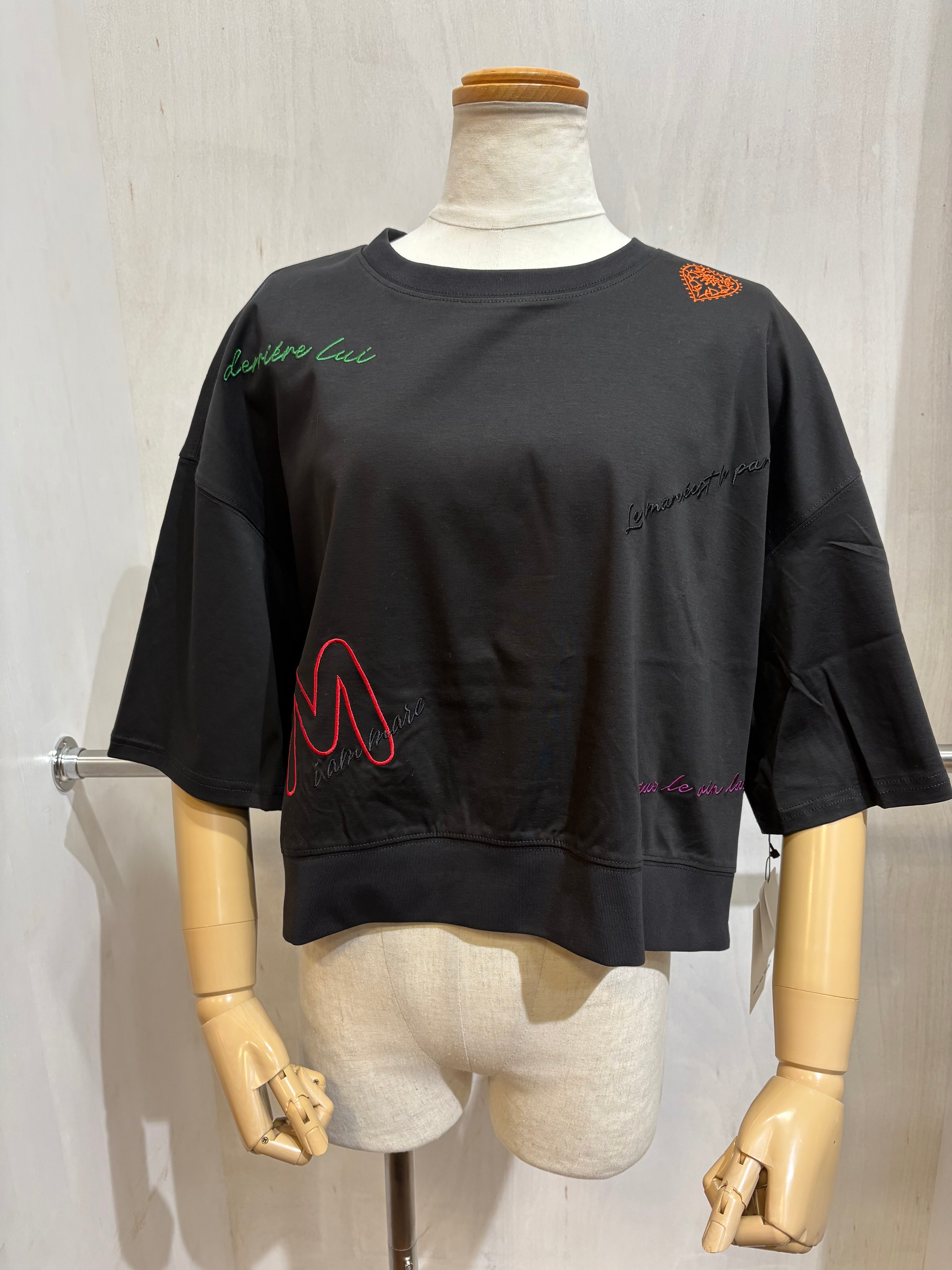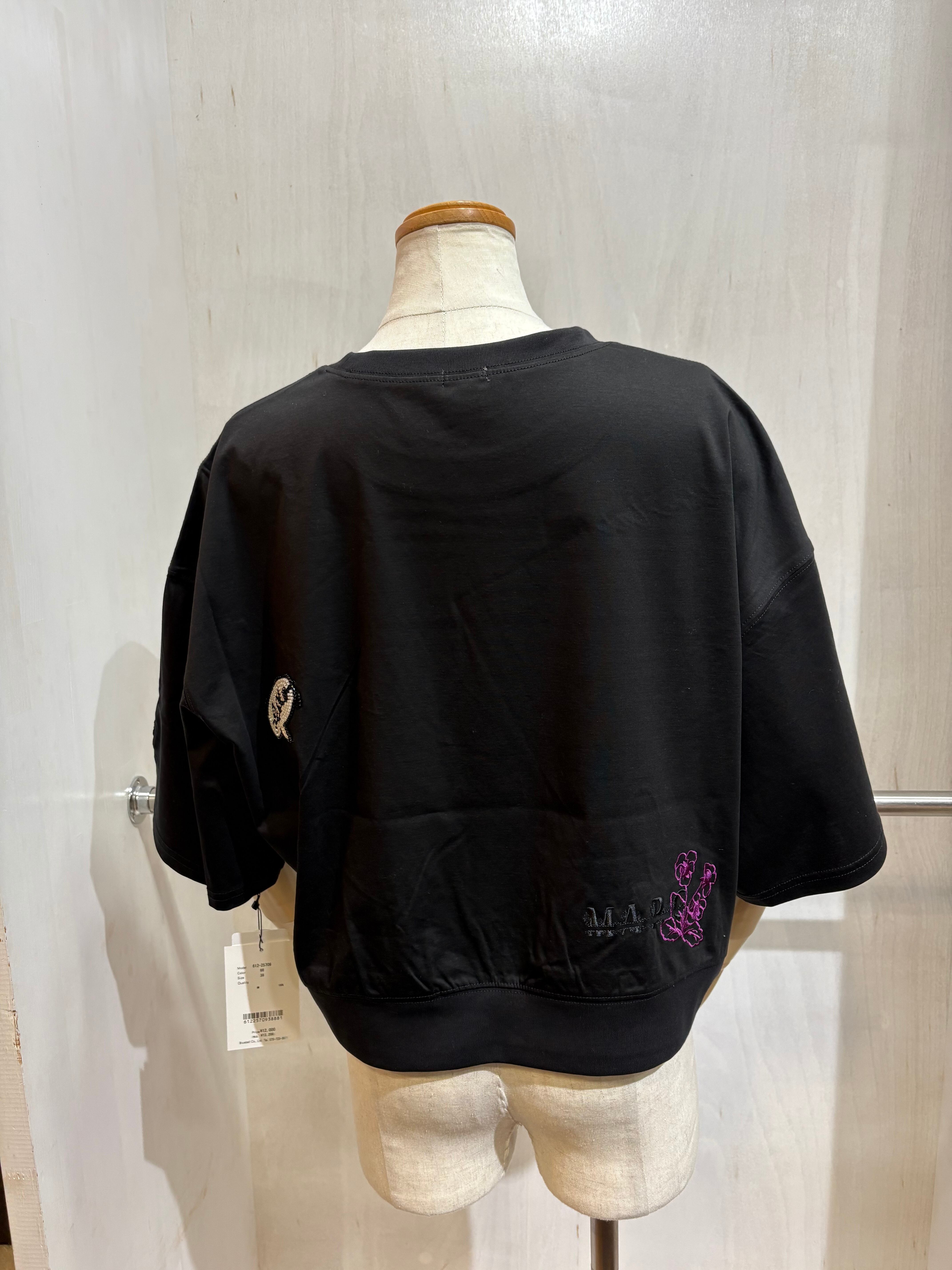 刺繍がたくさんのポイントに散りばまれたショート丈Tシャツ。