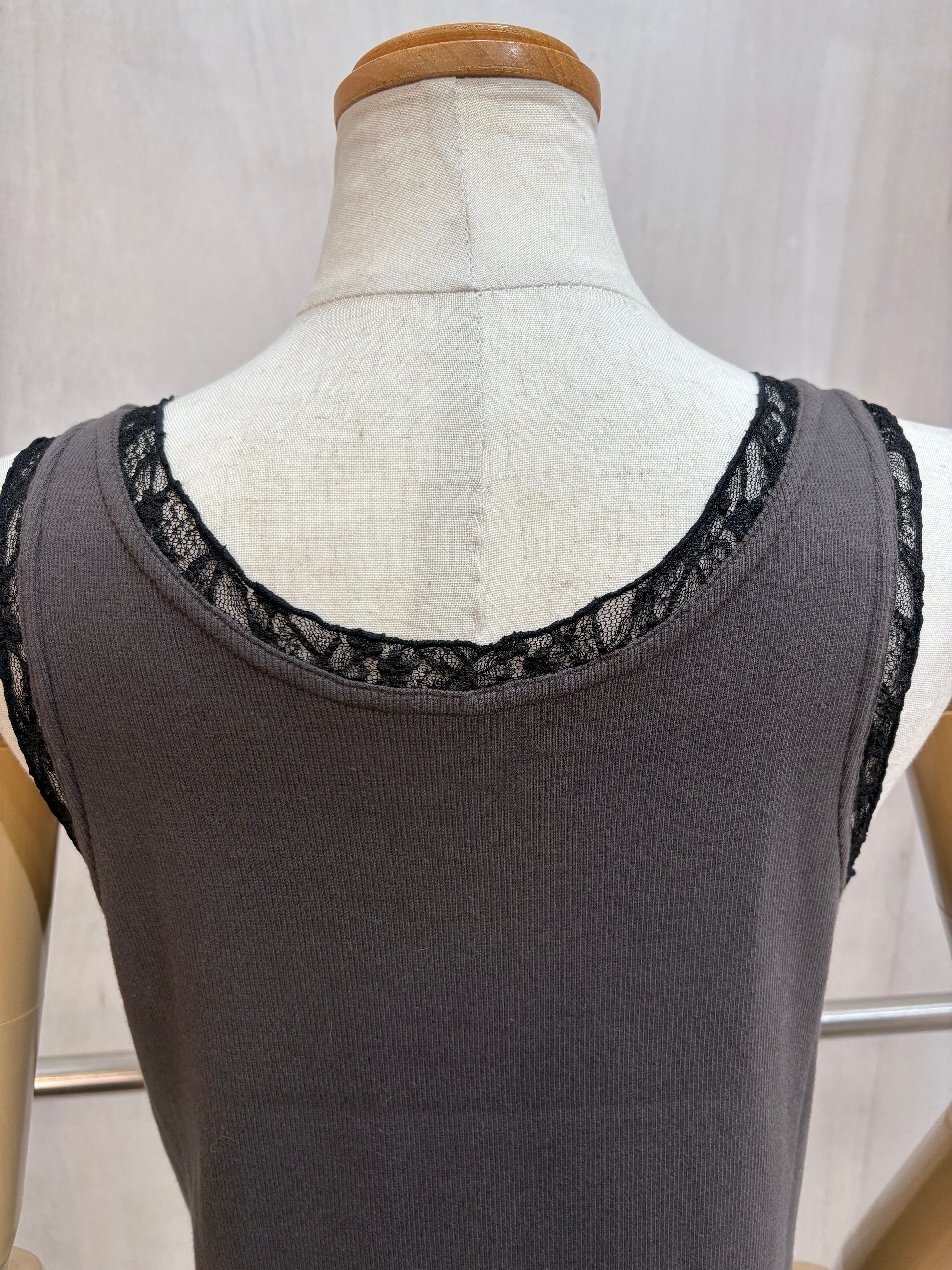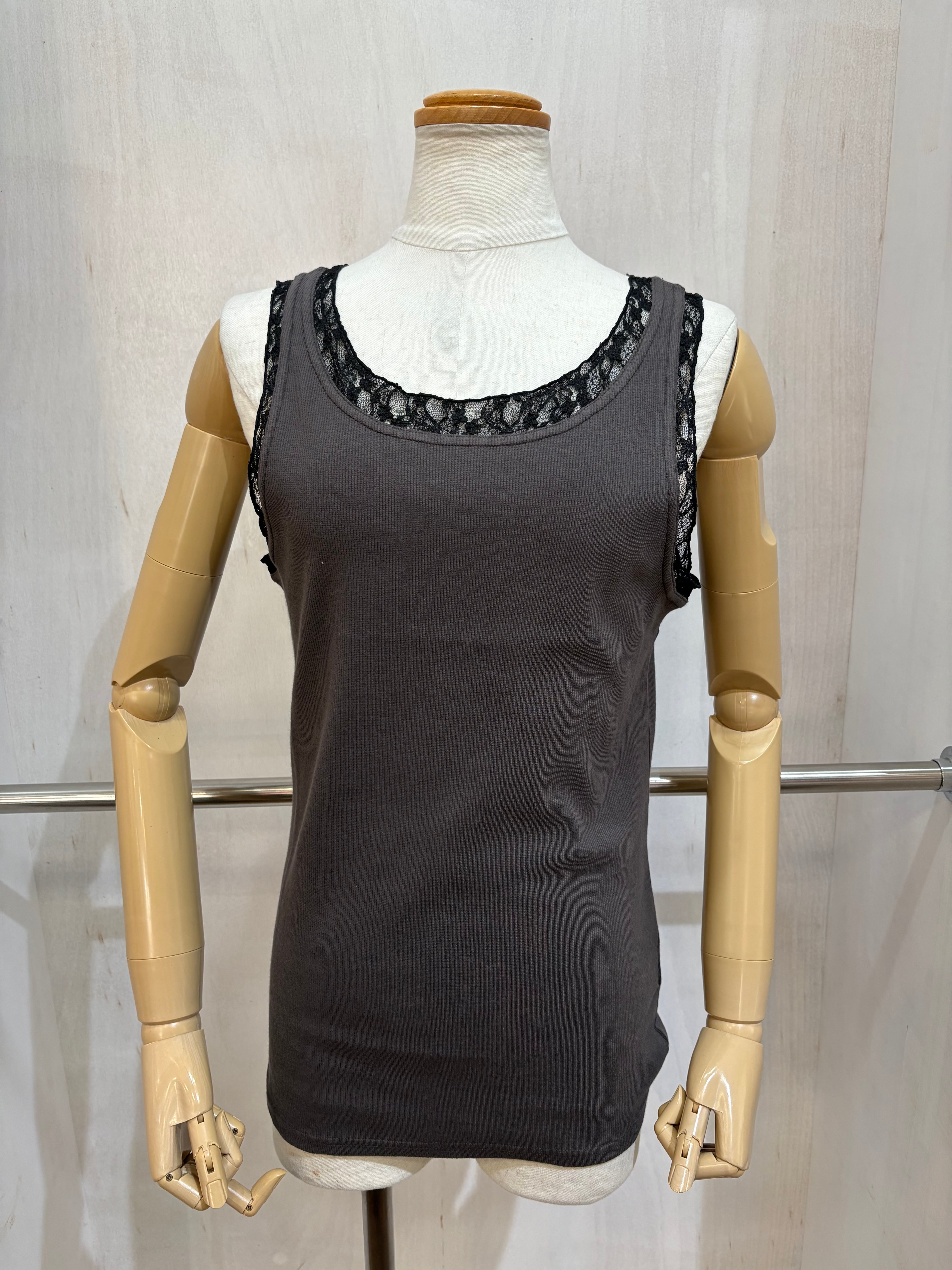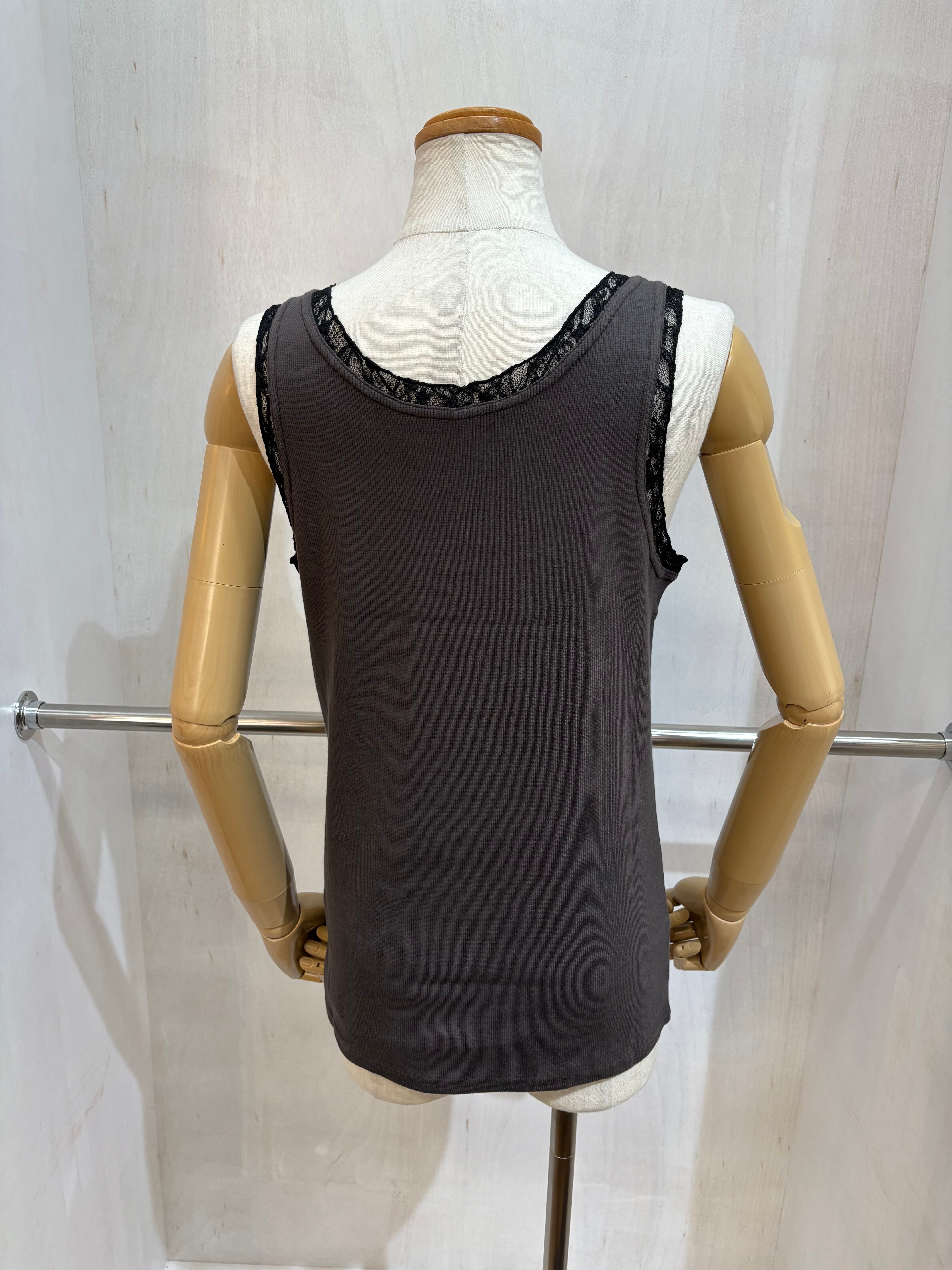 シンプルなデザインに、首周りや袖口にレースを配置した女性らしいタンクトップ。