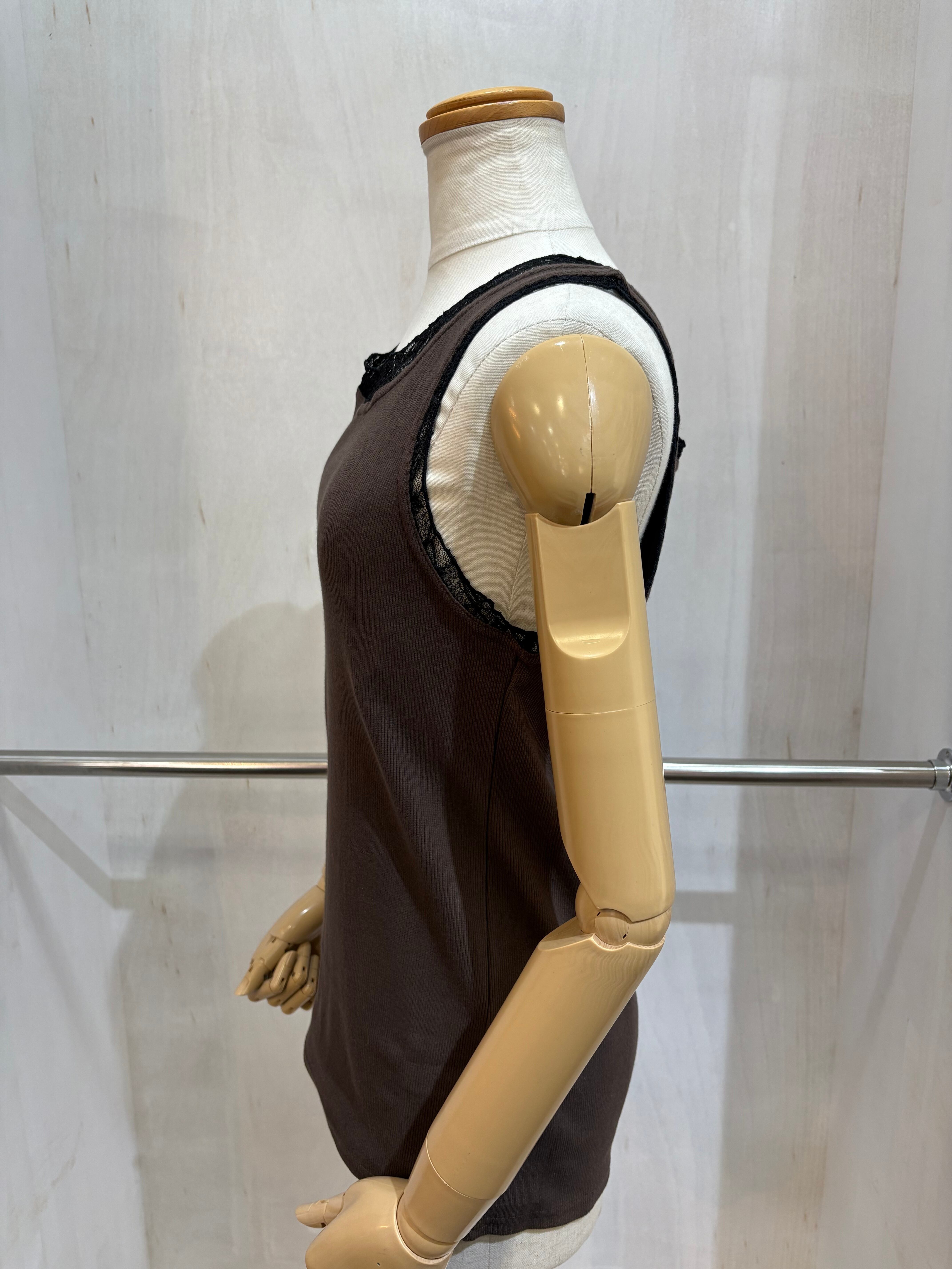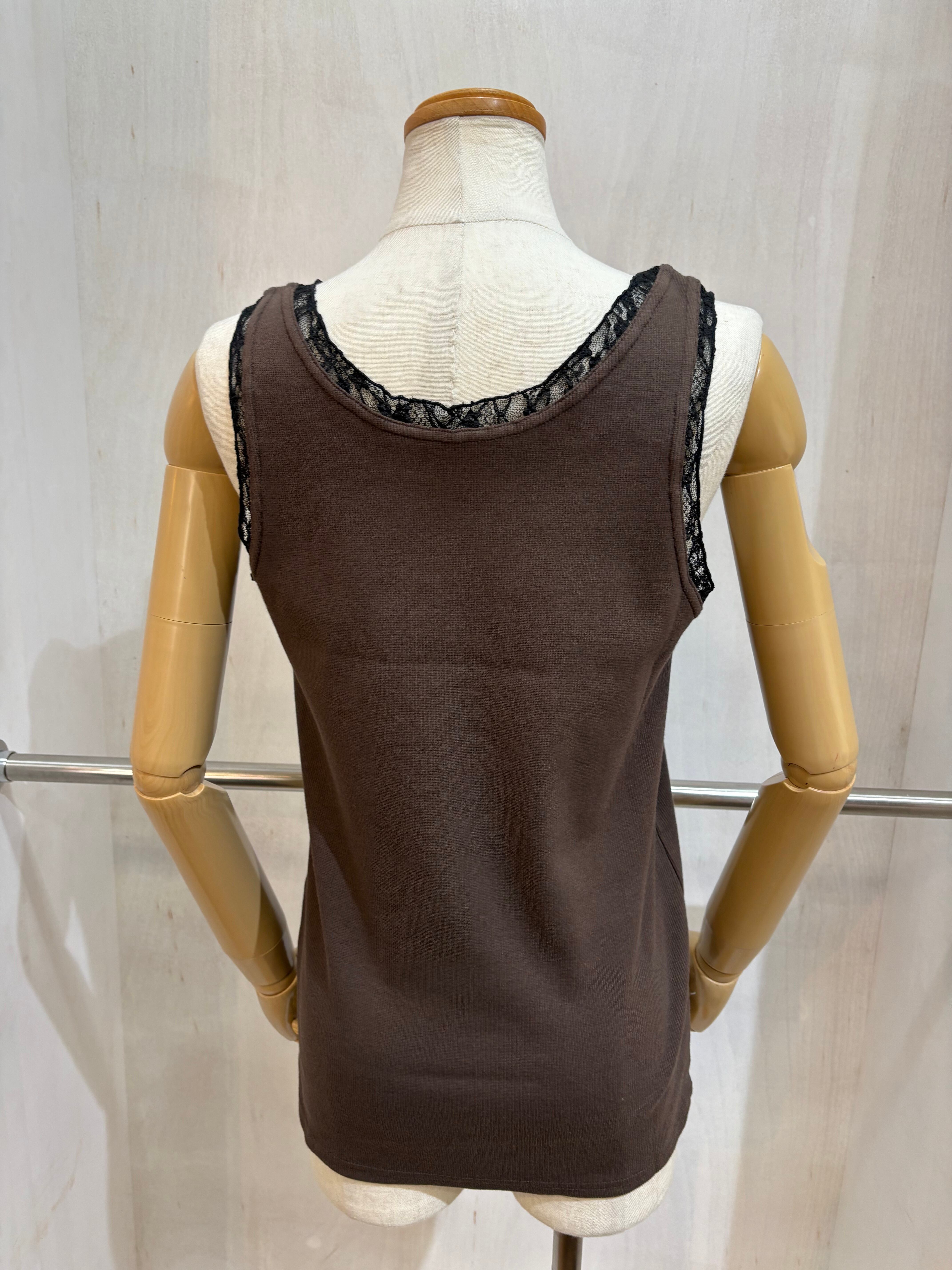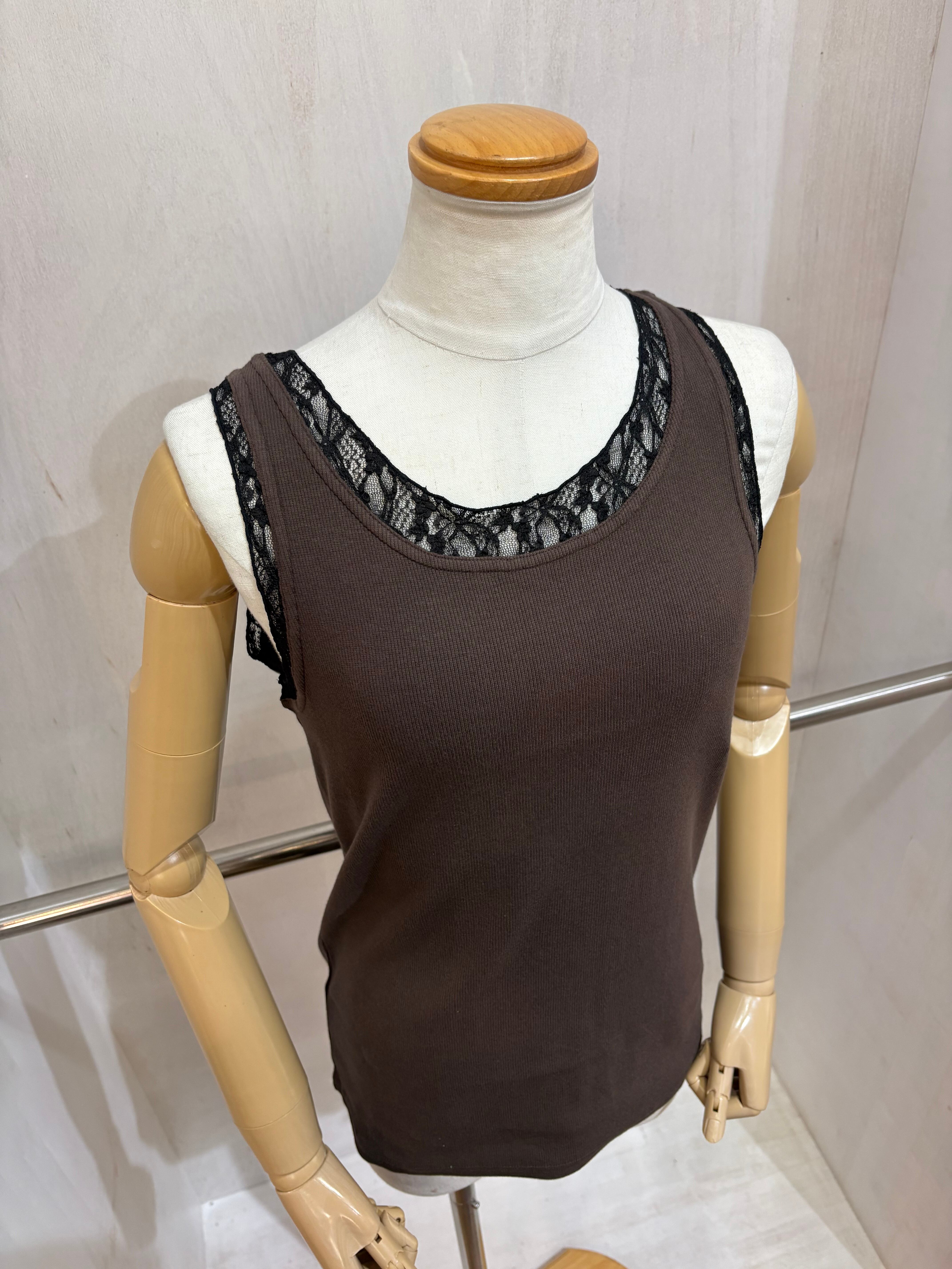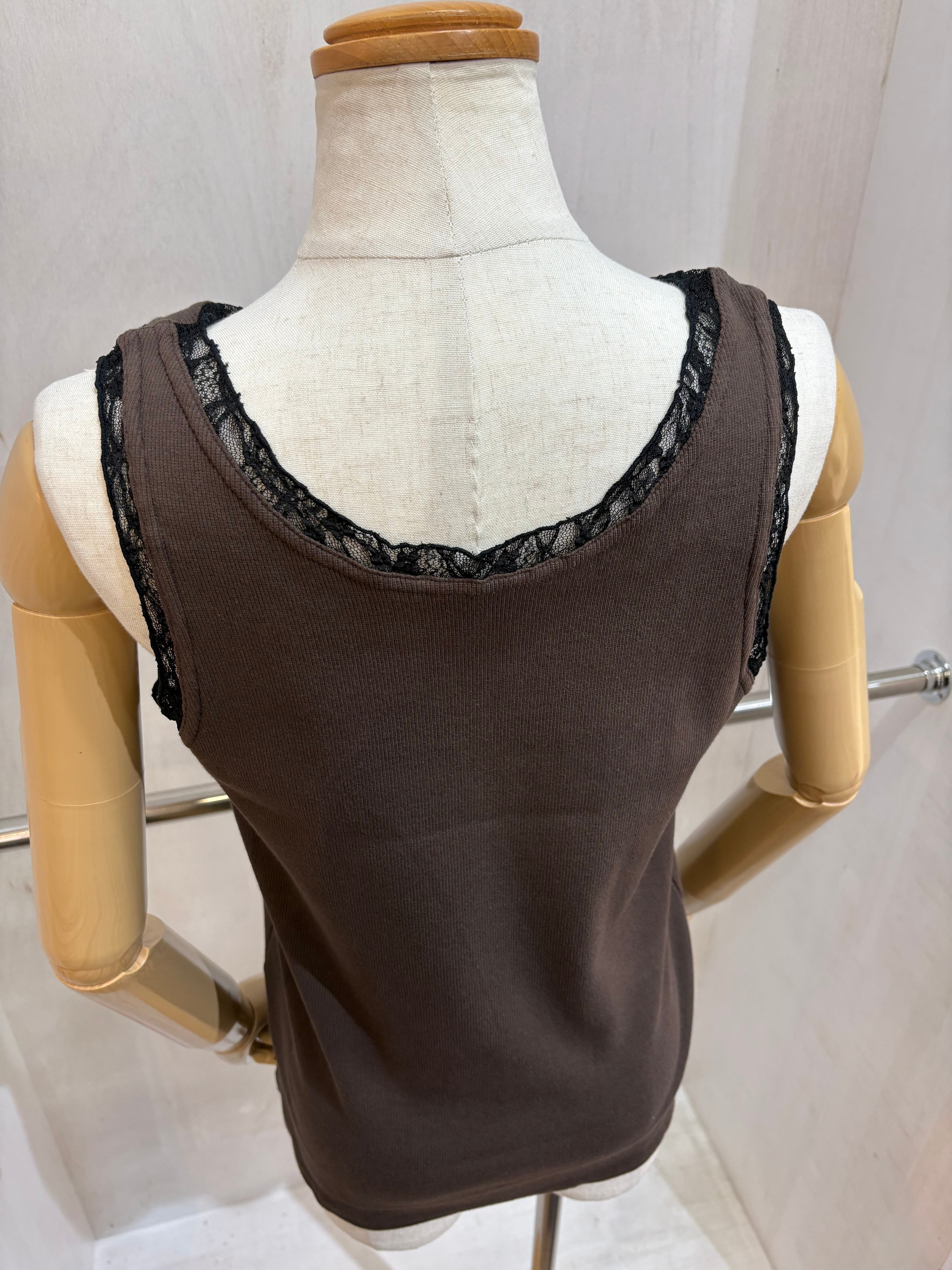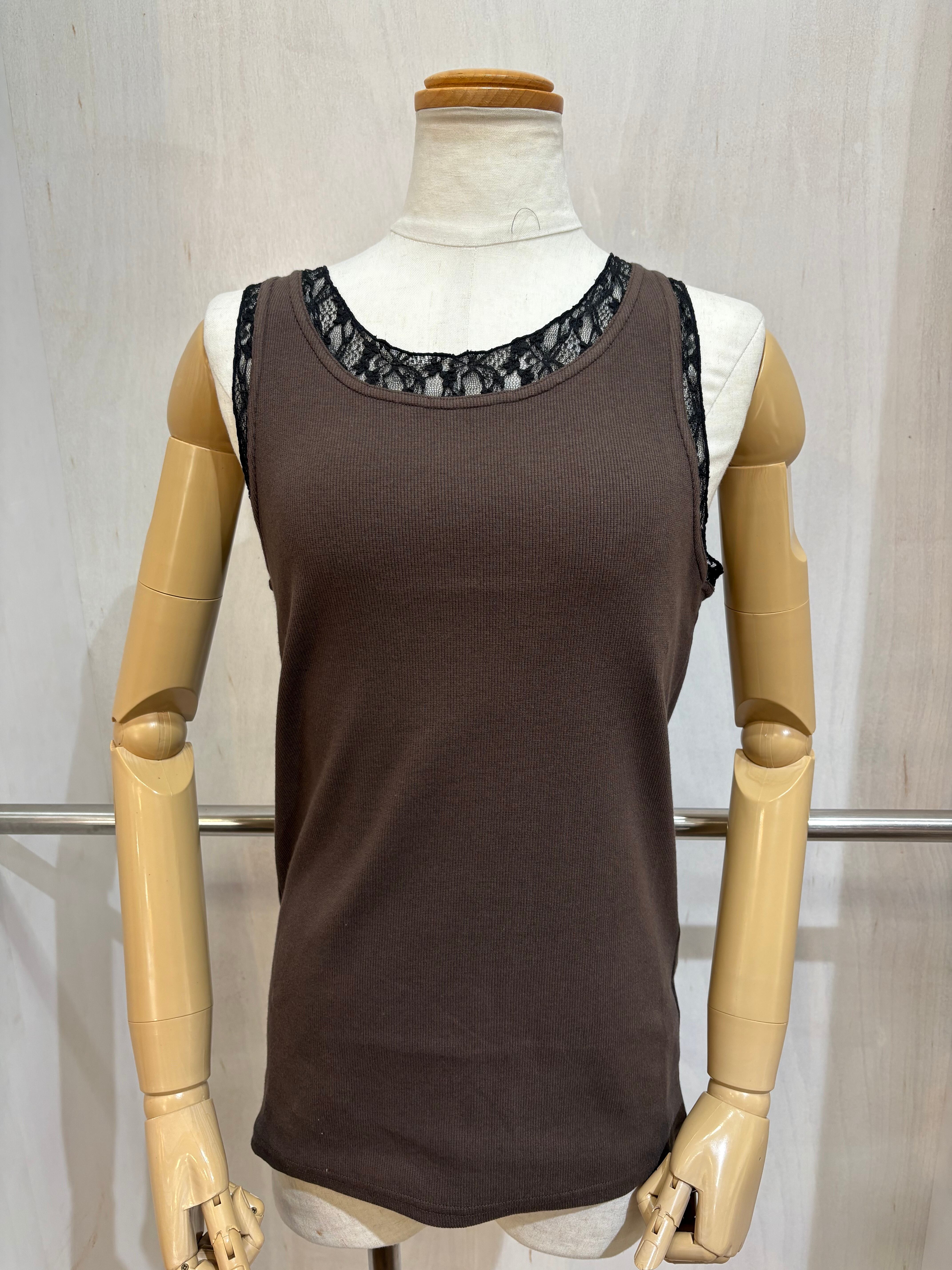 シンプルなデザインに、首周りや袖口にレースを配置した女性らしいタンクトップ。
