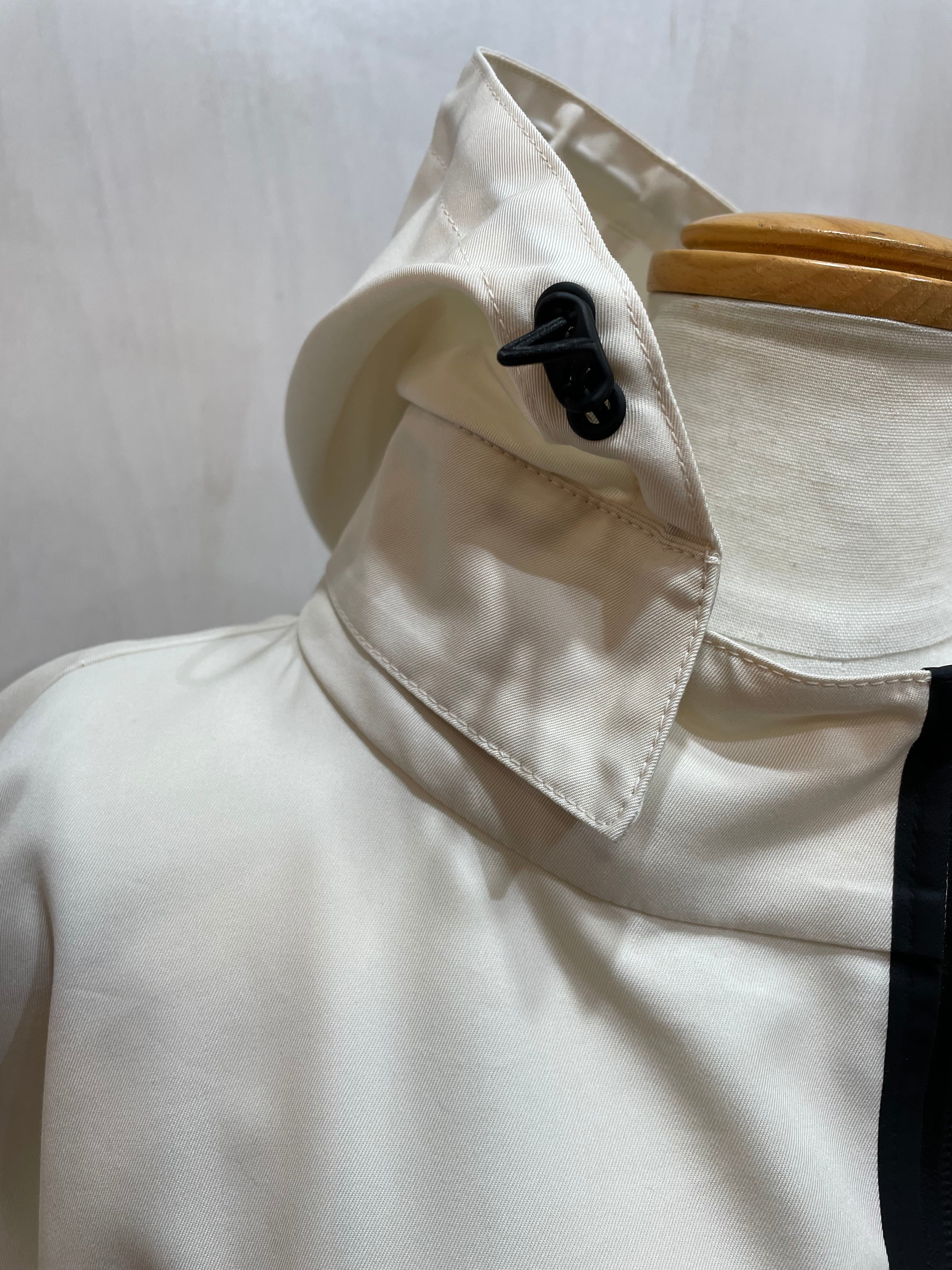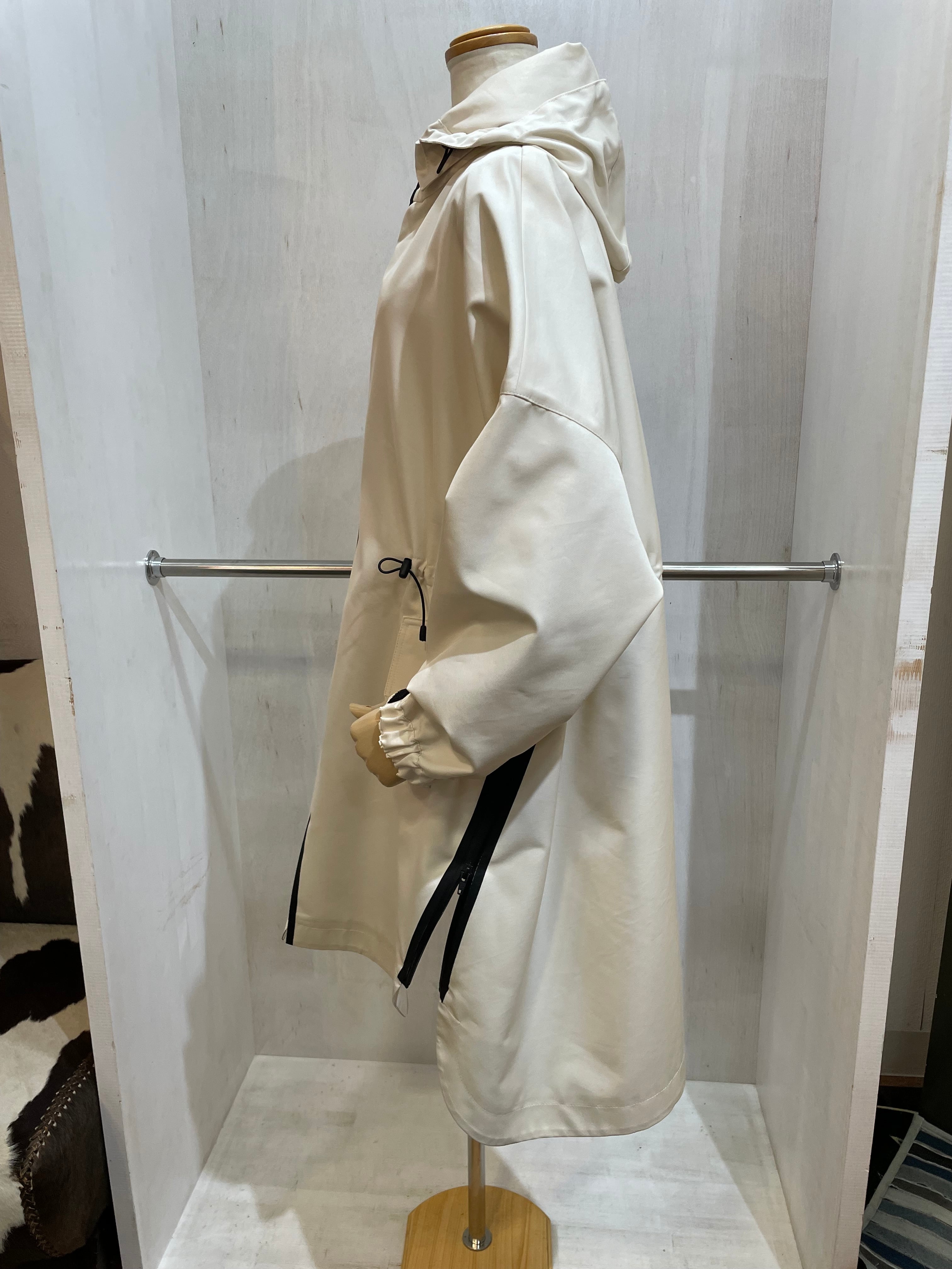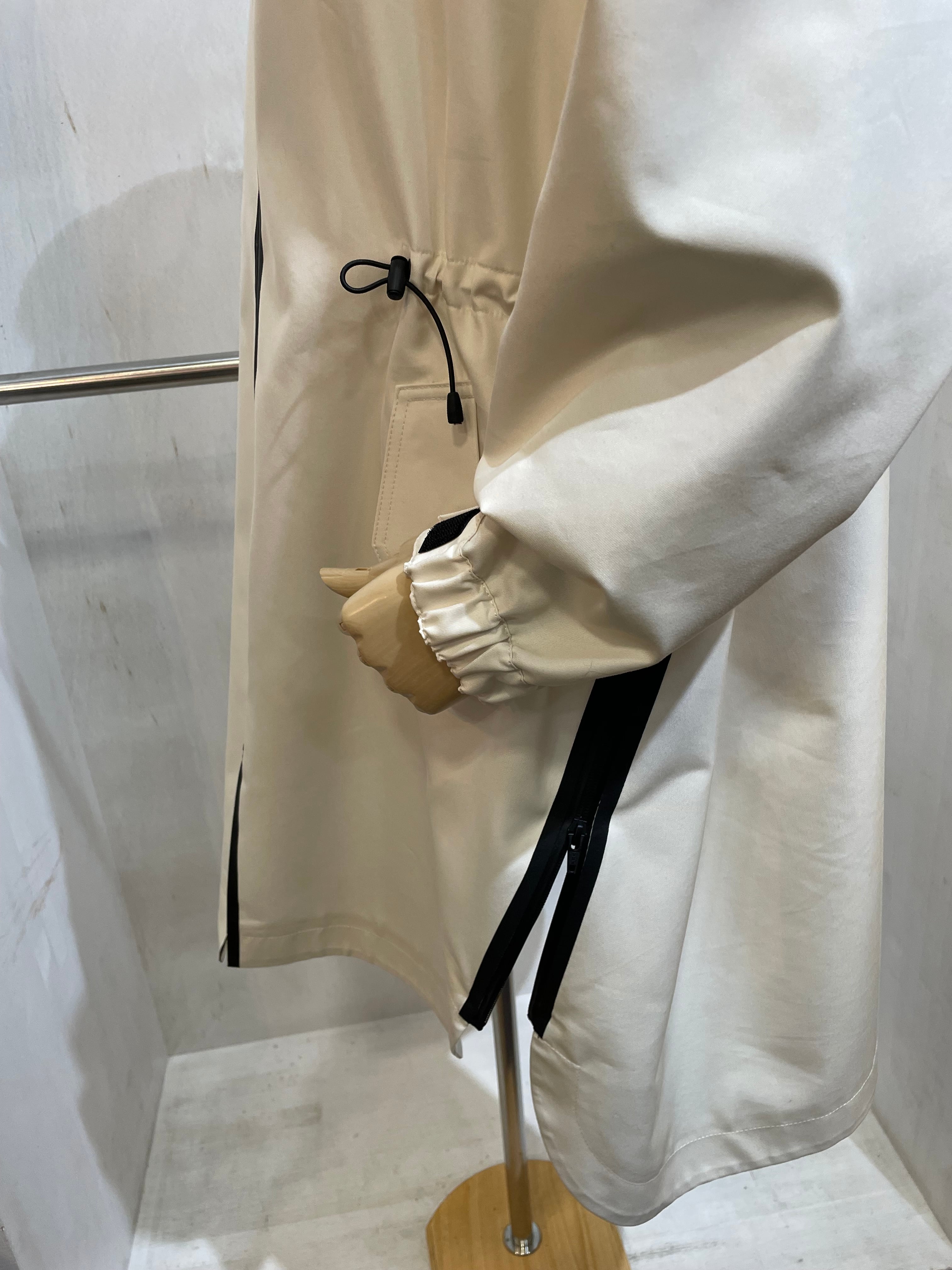 腰のラインにドローコード、サイドに斜めにジップスリット、パーカーの取り外しなどがえり、いろんなアレンジで着れる、万能コート。